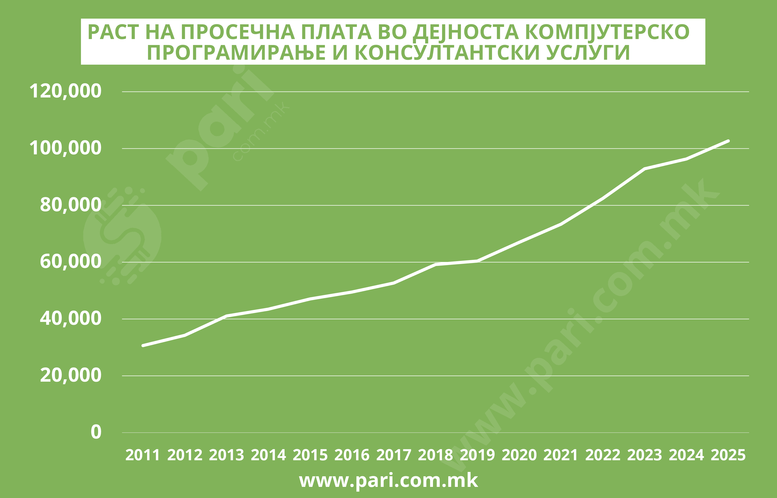 Во дејноста компјутерско програмирање во јули е исплатена највисоката просечна плата во износ од 102.869 денари, која во 2023 година изнесувала 92.871 денар, во 2020 година била 66.993 денари, а во 2011 година само 30.638 денари.