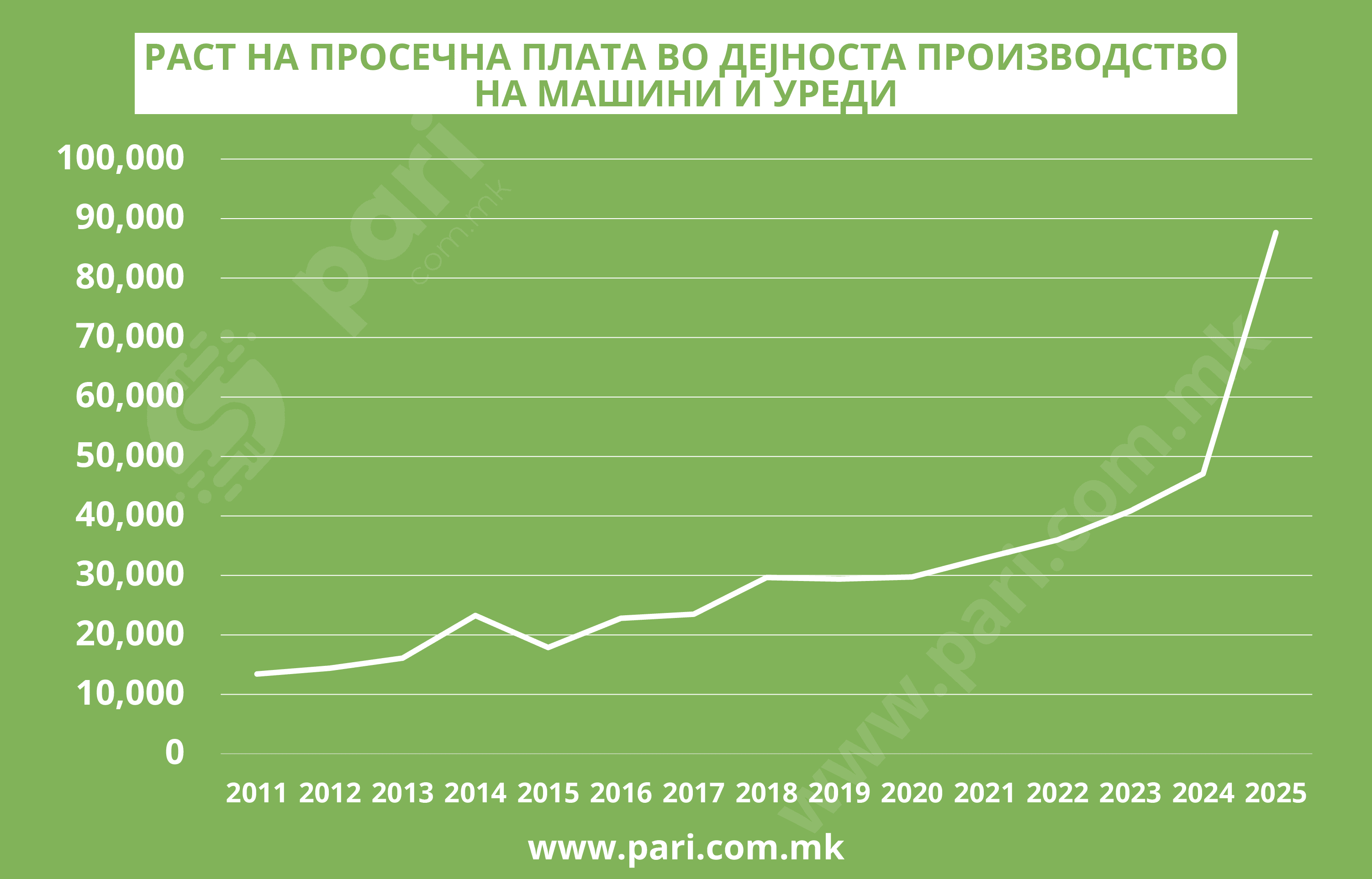 Втората по висина просечна плата е исплатена во индустријата за производство на машини, во износ од 87.646 денари. Интересно за оваа дејност е што за една година просечната плата е безмалку двојно зголемена. Просечната плата во 2024 година била 47.095 денари, а во јули оваа година достигна 87.646 денари. Во 2011 година, во овој сектор платите биле во просек 13.410 денари, во 2021 година надминале 31.000 денари, а во 2024 година стигнале до 47.000 денари.