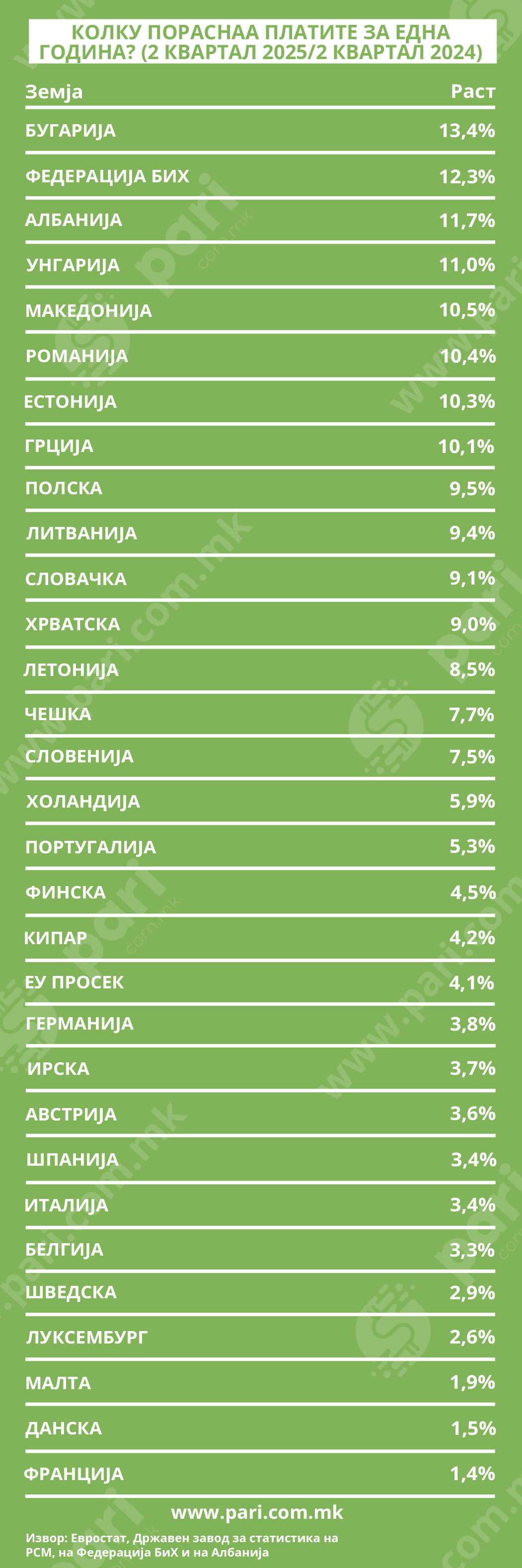 Во јули, Евростат измери најголем раст на просечната плата во Бугарија, од 13,4 насто. Следува Унгарија со 11,0 насто. Веднаш зад овие две земји членки на ЕУ е Македонија, со раст на просечната плата од 10,5 насто.