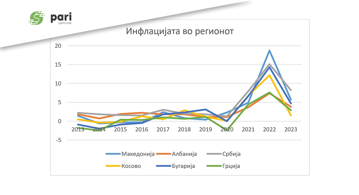 Со стапка на инфлација од 5,7 насто на крајот од 2023 година, измерена од Меѓународниот монетарен фонд врз основа на потрошувачките цени, во регионот Македонија стоеше полошо само од Србија, со инфлација од 8,2 насто, и од Хрватска, со инфлација од 6,2 насто.