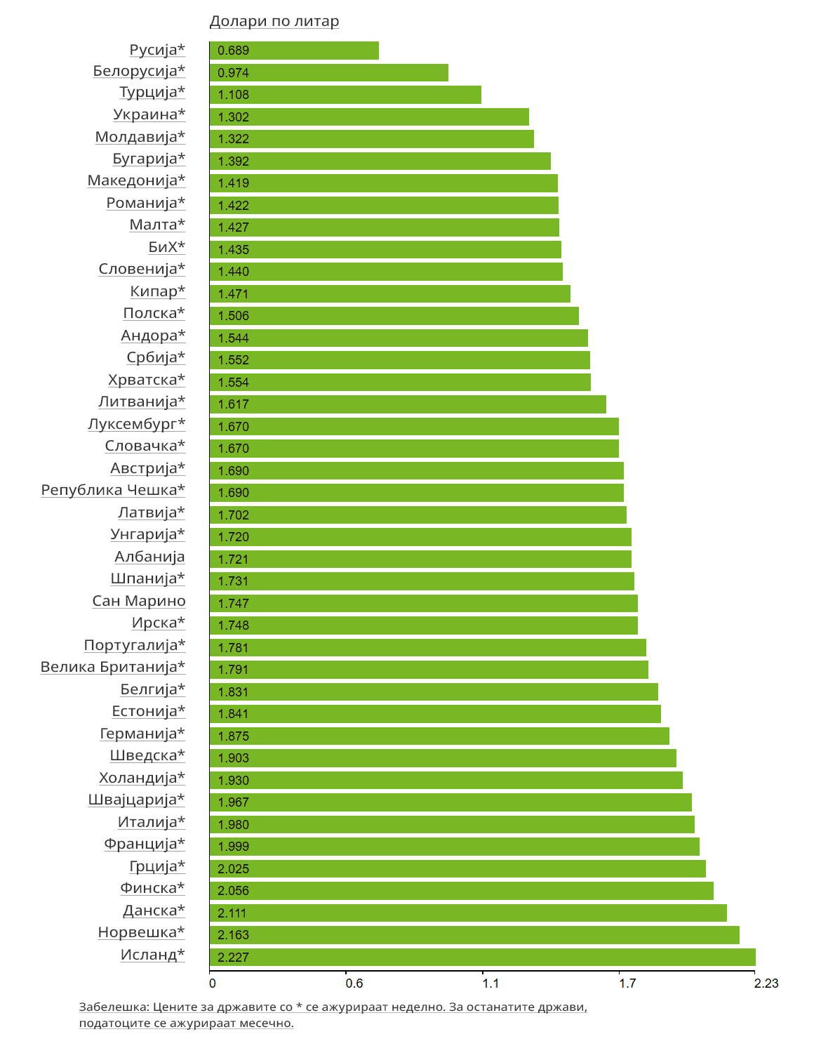 На табелата подолу е даден графички приказ на цените на Супер 95 по држави, според најновите расположливи податоци од 20-ти фебруари: