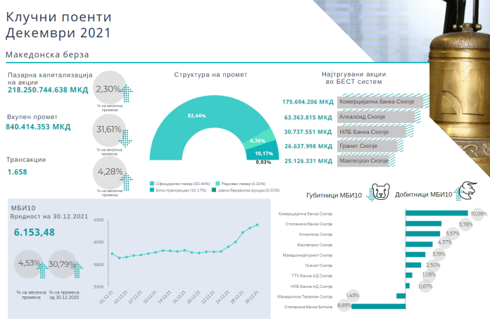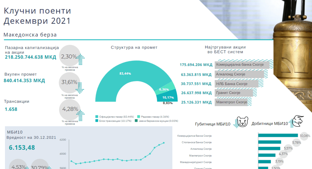 Според податоците кои ги објави Македонскта берза за периодот 01.12 – 31.12.2021 година вкупниот промет изнесувал 840.414.353 денари и е намален за 31,61 отсто во однос на претходниот месец, кога тој изнесувал 1.228.817.141 денари.
