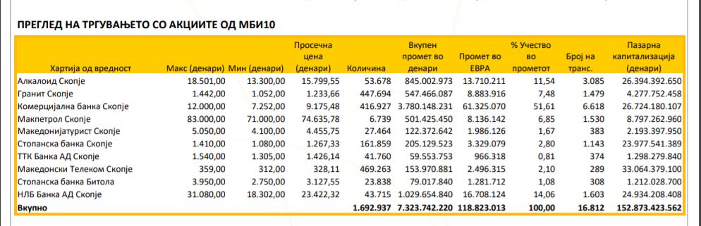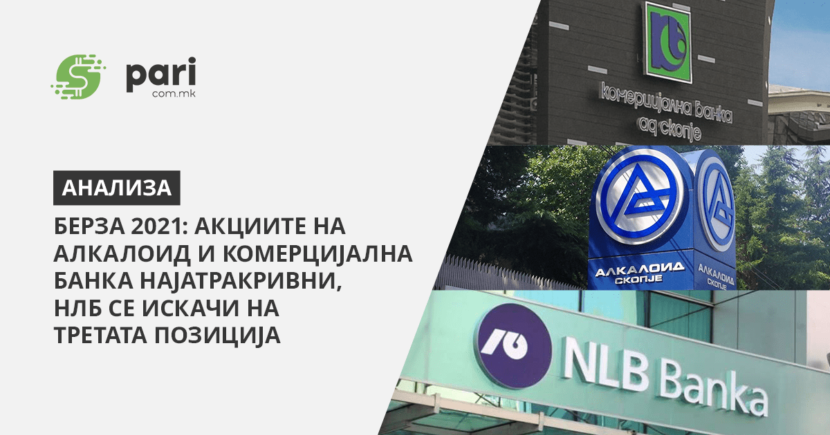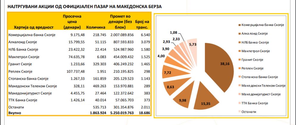 Идентично како и во 2020 година, на врвот најтргувани акции на официјалниот пазар за 2021 година првите две места остануваат непроменети. Лидер е Комерцијална Банка АД Скопје со истргувани 218.745 акции со просечна цена од 9.175,48 денари и остварен е промет од 2.007.089.856 денари или 32.635.607 евра, а веднаш до него е македонскиот фармцевтски бисер Алкалоид АД Скопје каде количински се истргувани 51.115 акции по просечна цена од 15.799,55 денари и се свртеле 13.131.607 евра или 807.593.833 денари. Третото место кое минатата година го држеше нафташот Макперол, оваа година изротира со НЛБ Банка АД Скопје. Оваа банка искачувајќи се едно скалило погоре ги запиша следниве бројки: истргувани 22.414 акции по просечна цена од 23.422,32 денари каде реализиран е промет од 524.987.960 денари или 8.536.389 евра.
