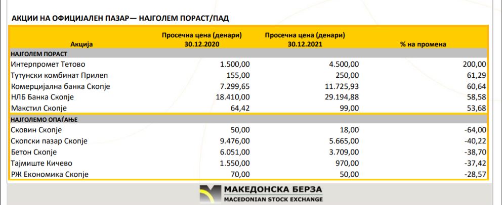 Компаниите кои имаат најголем раст на акциите во 2021 година се Интерпромет Тетово, Тутунски комбинат Прилеп, Комерцијална банка Скопје, НЛБ Банка Скопје и Макстил Скопје.