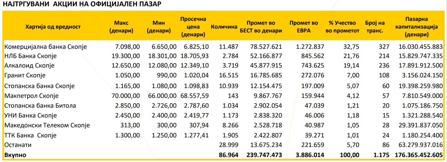 Најтргувани акции на официјалниот пазар за ноември се на Комерцијална банка Скопје, следи НЛБ Банка Скопје  и третото место го зазема Алкалоид Скопје.