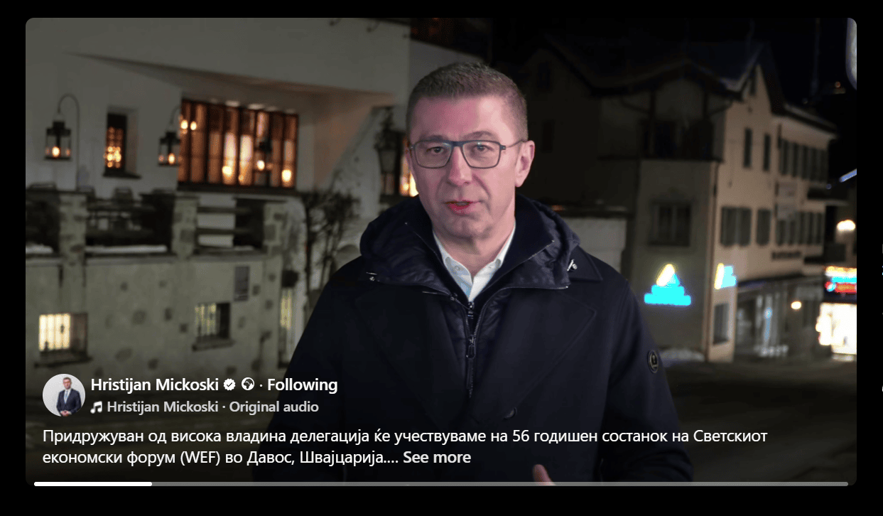 Својата посета на Давос Мицкоски ја најави и на својот Фејсбук профил, во видео обраќање од лице место, од Давос. „Ќе учествуваме на 56 годишен состанок на Светскиот економски форум (WEF) во Давос, Швајцарија. Следните денови ќе имаме бројни состаноци коишто очекуваме значително да влијаат на подобрување на економската состојба и привлекување на голем број на инвестиции. Учесник ќе бидам на три панели на коишто ќе ги презентирам можностите за инвестирање во Македонија, истовремено ќе оствариме и бројни билатерални средби со многу компании од светот. Очекувам плодни резултати, успешни состаноци и успешна посета во Давос“, напиша македонскиот премиер.