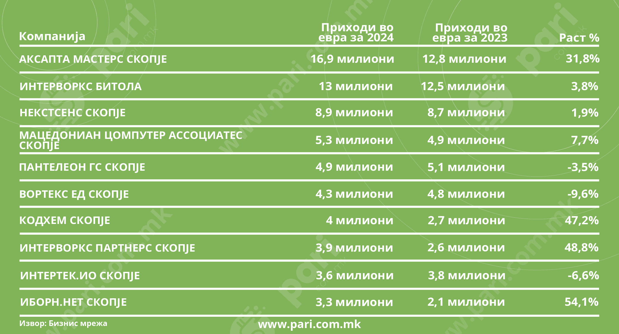 Од друга страна, најголем скок во приходи бележи Иборн.Нет, со раст од 54,1 насто, и Интерворкс партнерс (48,8 насто), како и Кодхем (47,2 насто). Овие податоци сугерираат дека има нов бран на динамични и иновативни фирми што брзо добиваат пазарен удел.