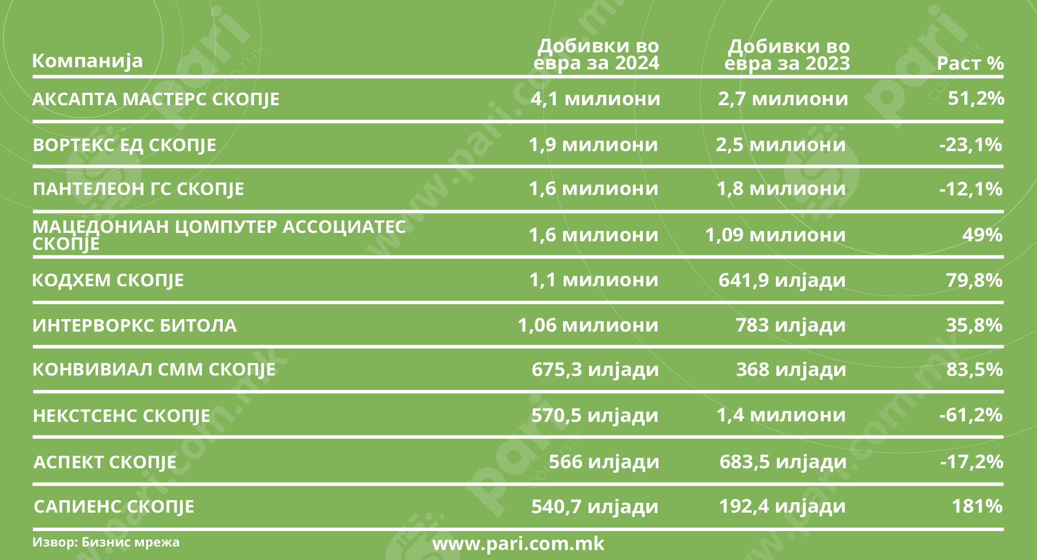 Најголема релативна добивка забележа Сапиенс, од 181 насто раст, што укажува на премин од стартап кон стабилна профитабилност. Оваа компанија има остварено заработка од 540,7 илјади евра.