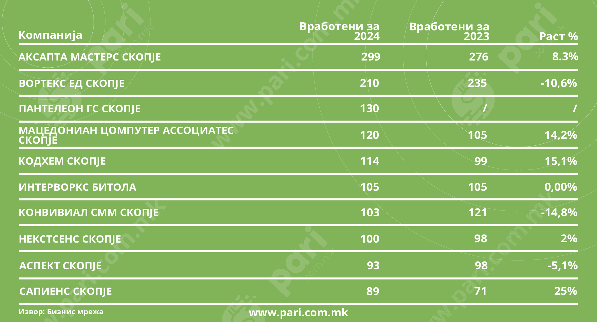 Последна на листата е скопската Кодхем со 89 вработени, но има највисок раст во однос на 2023 година (25 насто).