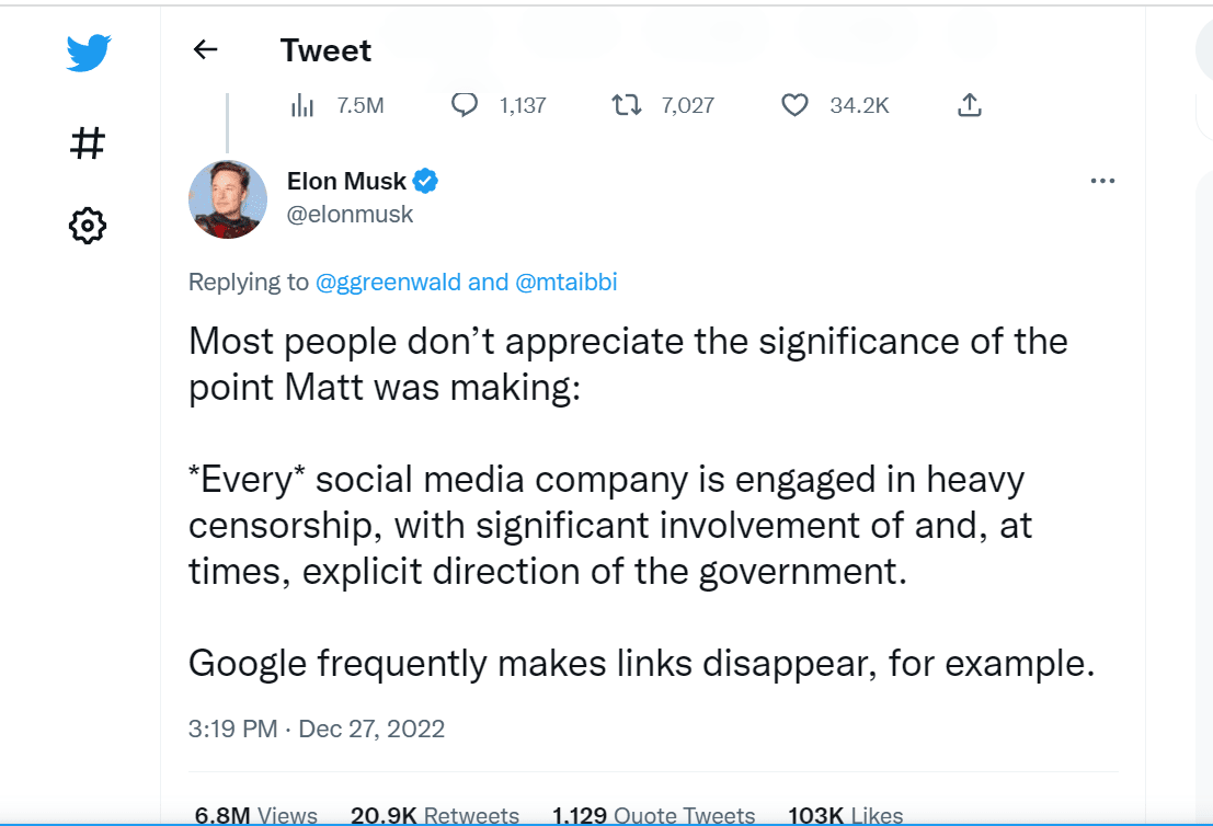 „*Секоја* компанија за социјални медиуми е ангажирана во тешка цензура, со значителна инволвираност и, понекогаш, експлицитна насока на владата“, напиша Маск на Твитер, додавајќи дека „Гугл често прави линкови да исчезнуваат, на пример“.