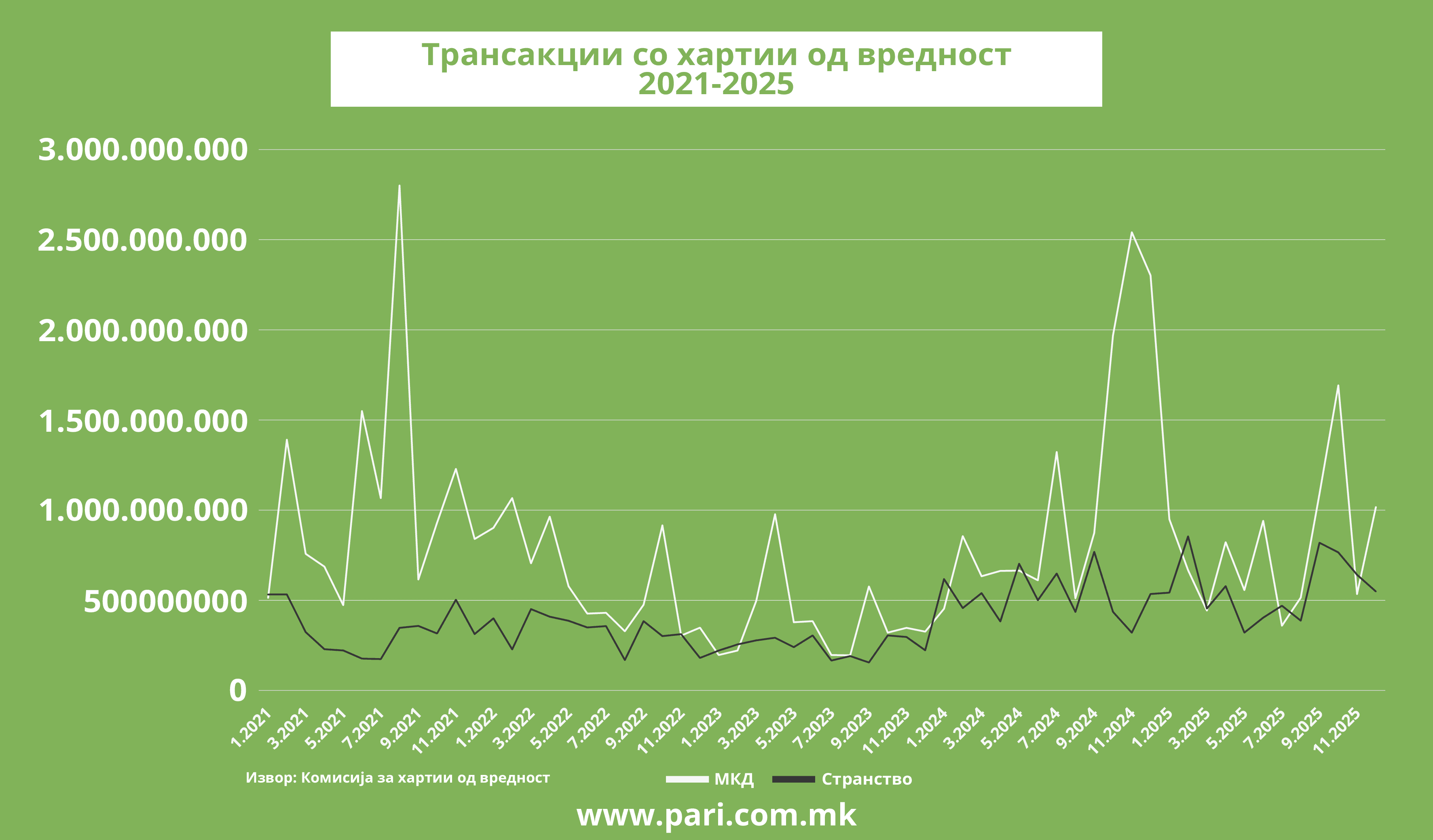 Месечните податоци обезбедени од статистиката на Комисијата за хартии од вредност покажуваат уште појасна динамика: кај странските акции има континуитет, помали осцилации и постепен нагорен тренд, додека кај домашните вложувања доминираат нагли скокови и подолги периоди на тишина.