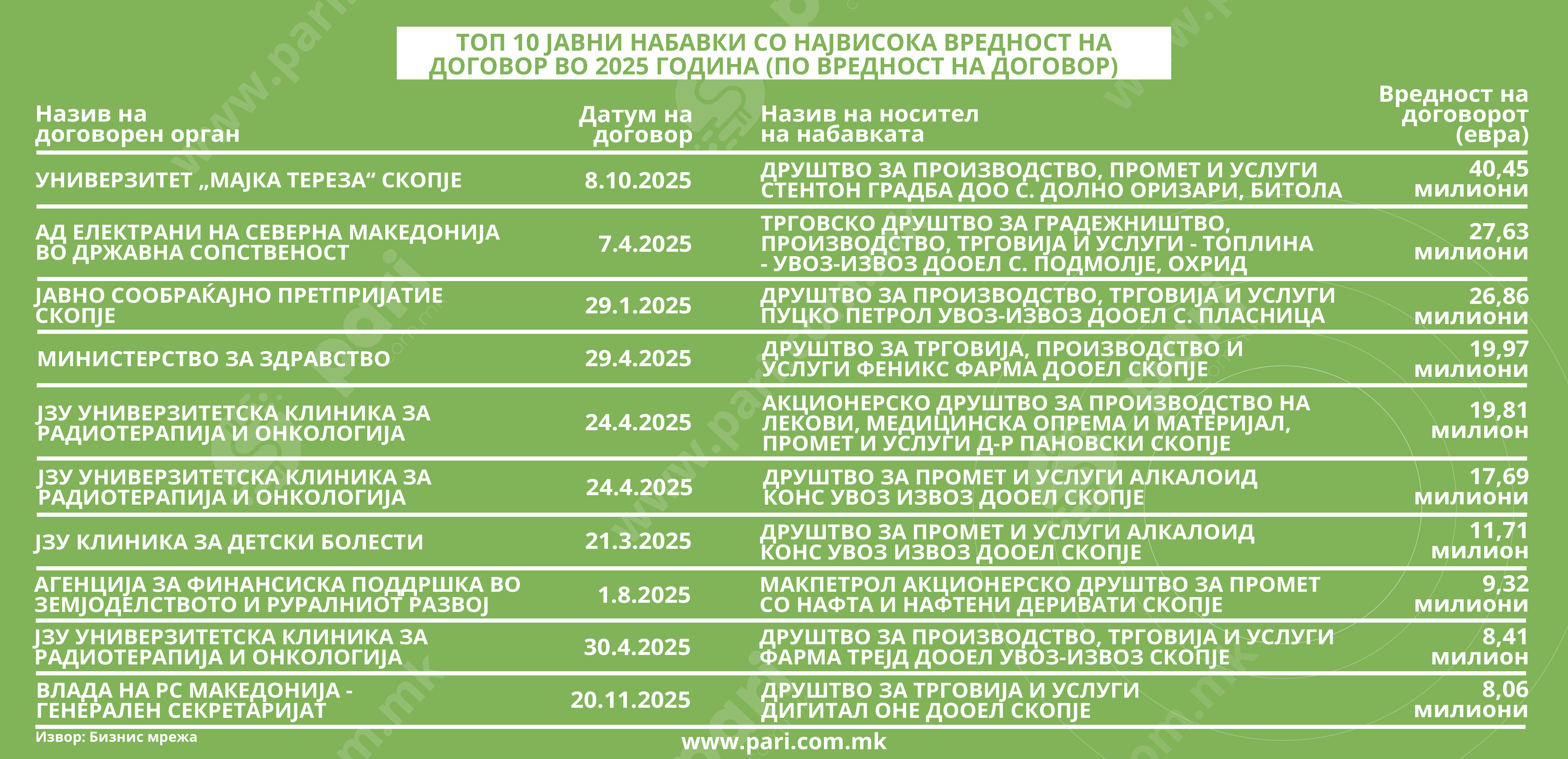 Податоците на БизнисМрежа, застапени во оваа анализа на Пари, упатуваат на фактот дека вкупната вредност на најголемите десет доделени тендери е 189,91 милион евра. Овие јавни набавки се договорени со девет компании.