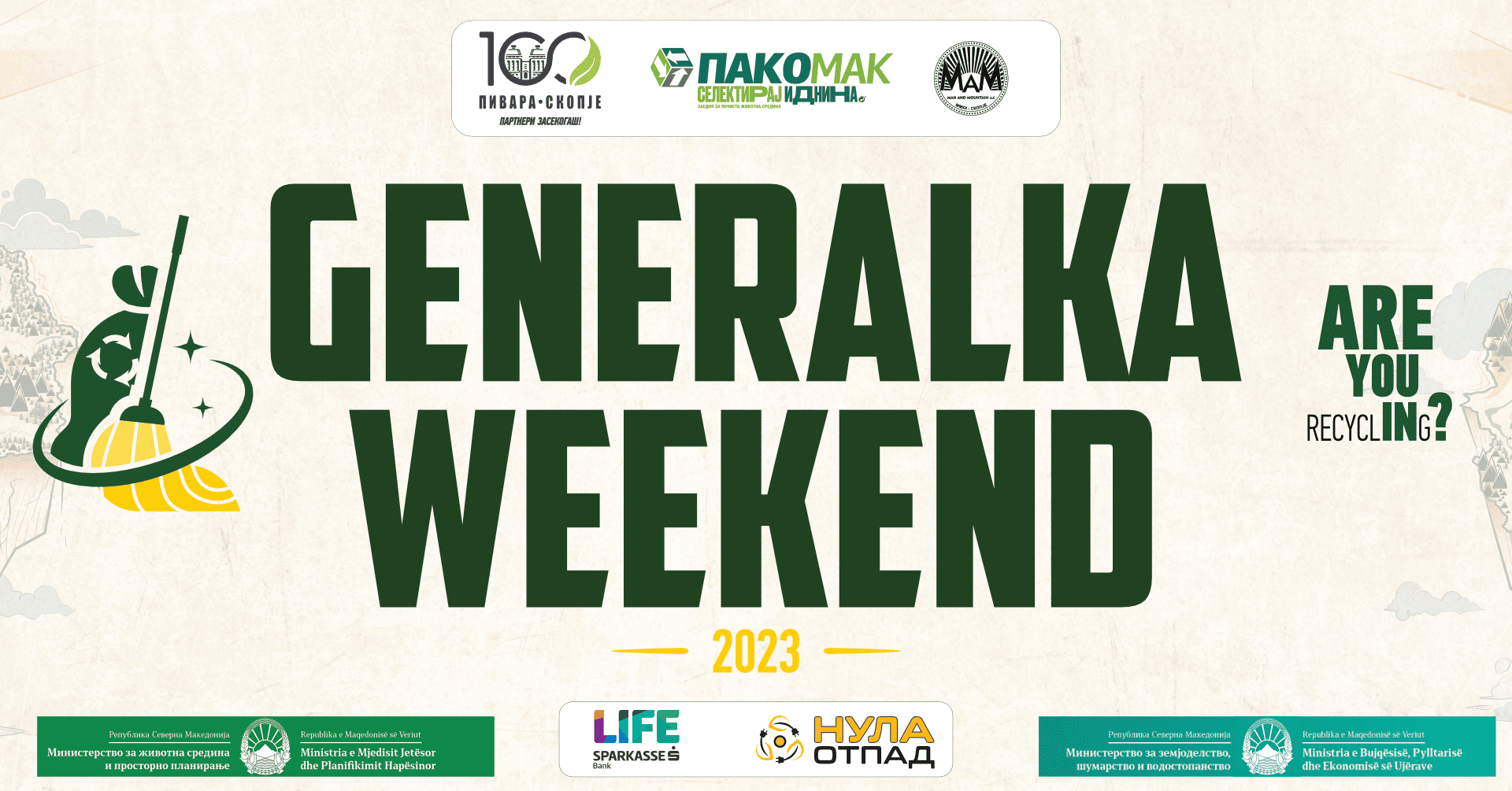 Продолжува стратешкото партнерство помеѓу Мен Енд Маунтен, Пивара Скопје и Пакомак, поддржано од Шпаркасе Банка и Нула Отпад, Министерството за животна средина и просторно планирање и Министерството за земјоделство, шумарство и водостопанство, во третата по ред еколошка акција – ГЕНЕРАЛКА ВИКЕНД. Акцијата годинава се спроведува во 53 општини и 450 училишта низ државата со повеќе од 16 000 волонтери.