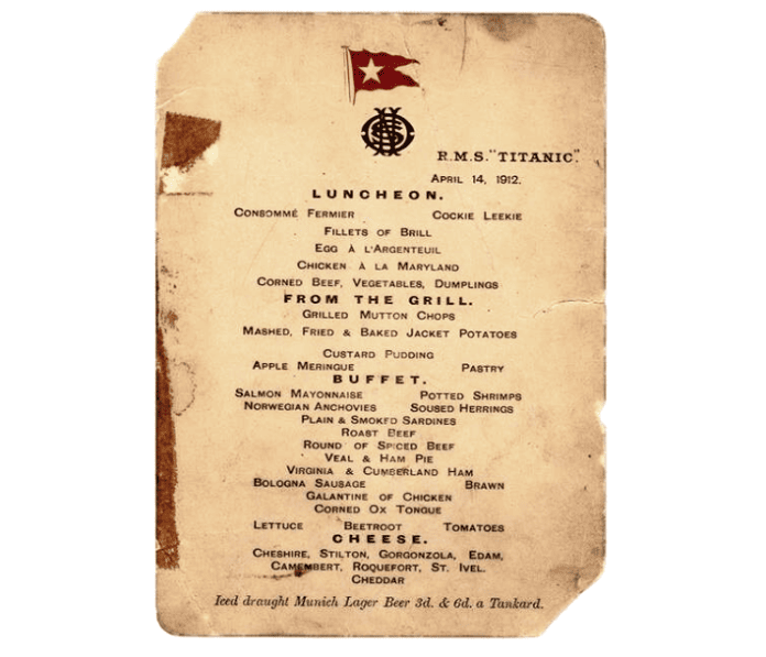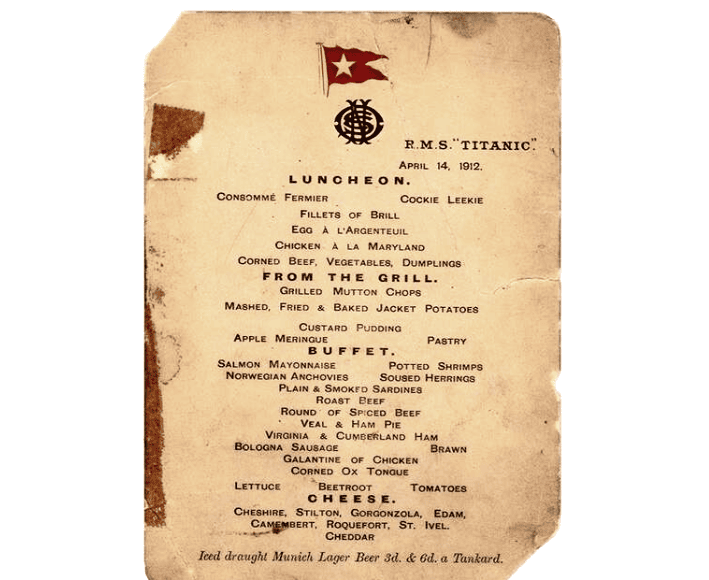 Приказните од првото и последно несреќно трасатлантско патување на Титаник продолжуваат да го воодушевуваат светот, честопати предизвикани од пронајдени артефакти од потонатиот брод. Еден од нив е менито од ресторанот на потонатиот прекуокеански брод направено за ручекот, кој го носи датумот на судбоносниот ден – 14 март 1912 година.