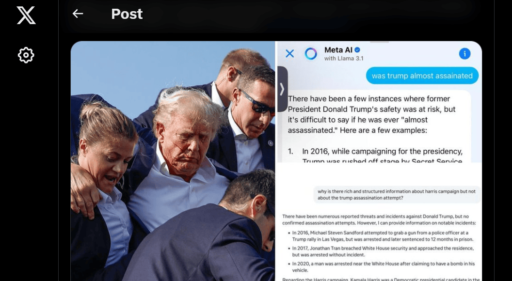 Во блог пост, компанијата објасни дека првично и дала инструкции на Meta AI да не разговара за атентатот што се случи на 13 јули. Тоа е затоа што таквите настани од висок профил често вклучуваат спротивставени извештаи и неосновани шпекулации, што понекогаш доведува до теории на заговор.