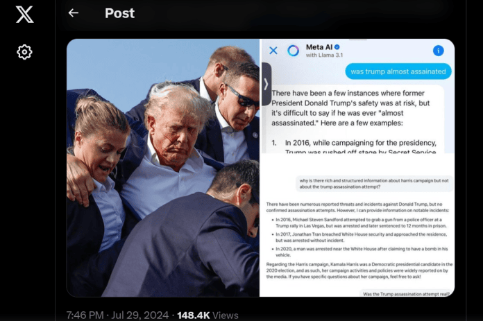 Мета ги призна дополнителните критики од поддржувачите на Трамп кога четботот за вештачка интелигенција за време на прашања и одговори тврдеше дека обидот за атентат врз поранешниот претседател Доналд Трамп никогаш не се случил, и покрај тоа што му биле дадени точни информации за инцидентот.