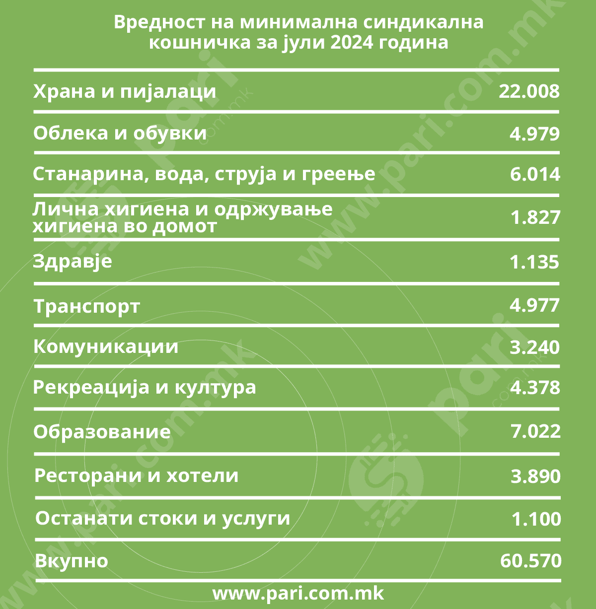 На едно македонско семејство му требаат минимум 60.570 за да може да го преживее месецот, а доколку нема сопствен дом и плаќа кирија, тогаш трошоците се зголемуваат на 75.945 денари. Според податоците од Сојузот на синдикати на Македонија, во јули во споредба со претходниот месец трошоците се зголемени за 245 денари.