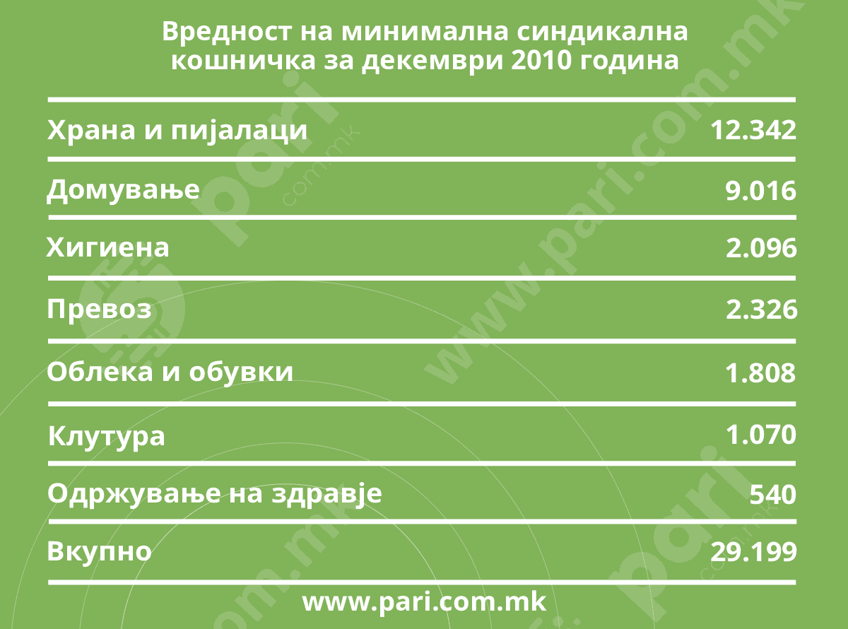 За споредба, во декември 2010 година, кога ССМ за првпат објави податоци за синдикалната кошница, таа тежела 29.199 денари, а декемвриската просечна нето-плата била 21.454 денари. Разликата меѓу кошницата и просечната плата пред 14 години била 7.745 денари.