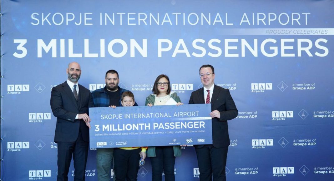 Милена Таскова, која денес авионски патуваше од Скопје до Бари е тримилионитиот патник кој годинава минал низ Меѓународниот аеродром „Скопје“. Од ТАВ Македонија како подарок доби бесплатни аеродромски услуги од сестринските компании, како и два гратис билети од „Визер“.
