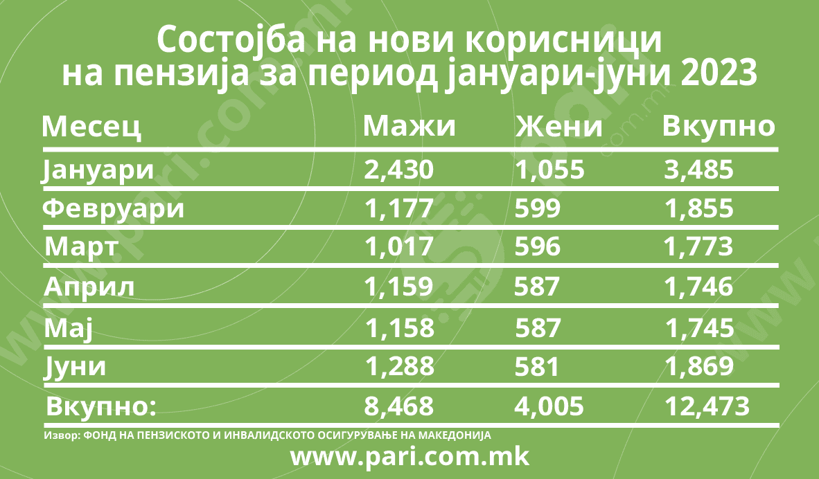 Од почетокот на годината и заклучно со јуни, бројот на пензионерите во државата е зголемен за 12.473. Најголемиот дел од нив, 3.485, оваа 2023 ја стартувале отворајќи ја новата – пензионерска страница. Во вкупниот број пензионирани во тие шест месеци доминираат мажите – 8.468. Нови пензионерки се 4.005.