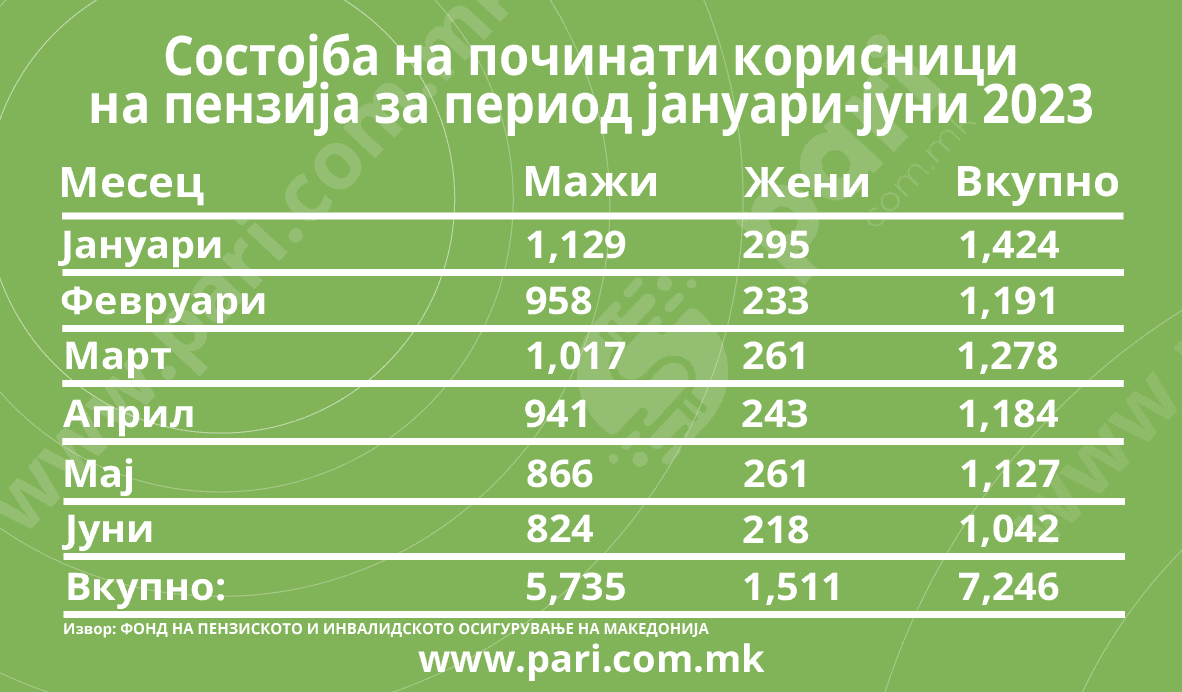 Темната статистика, која ги евидентира починатите, вели дека во првата половина од годинава 7.246 лица се „одјавиле“ од пензионерскиот список. И во овој случај повеќето од починатите се мажи – 5.953. А, само во јуни се пријавени 1.042 починати корисници на пензија, 824 мажи и 218 жени.