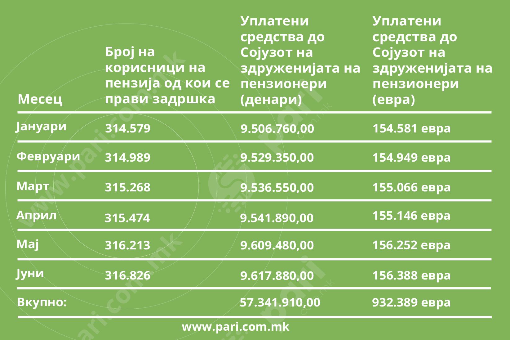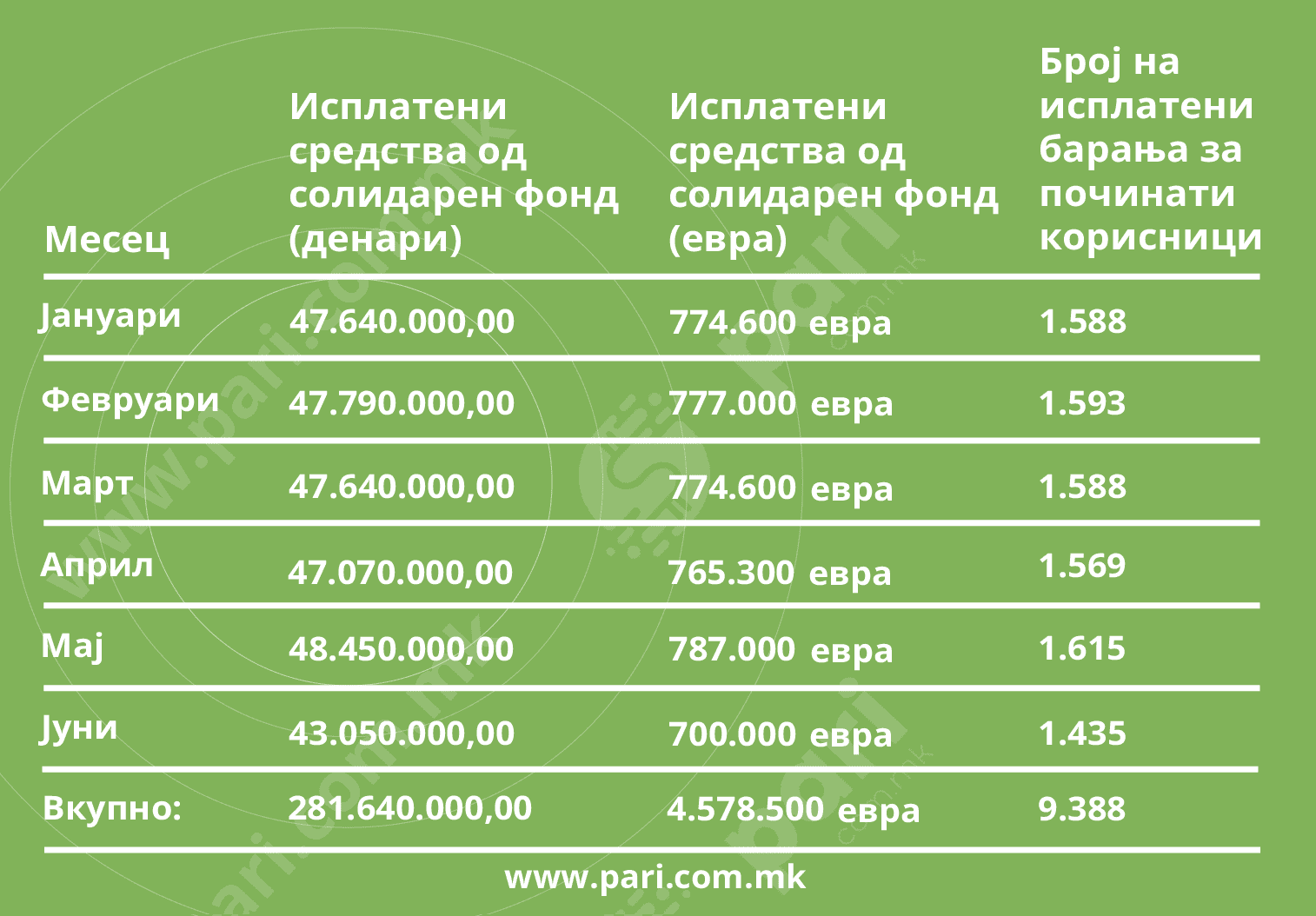 Во текот на шестте месеци од годинава растел бројот на пензии од кои се издвојувале средства за Солидарниот фонд, од 314.579 во јануари до 316.826 во јуни, а вкупниот прилив изнесува 931,3 илјади евра. Заклучно со јуни бројот на пензионерите е зголемен за 12.473, а од списокот се „одјавиле“ 7.246 лица