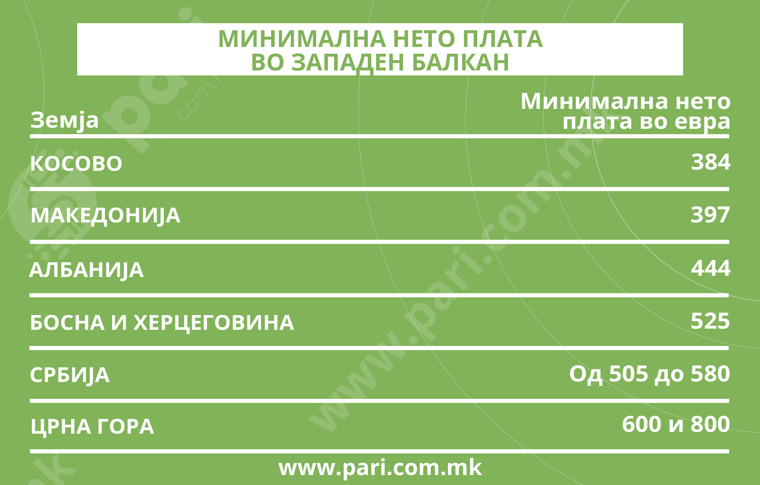 Податоците од регионот покажуваат јасна разлика во пристапот кон минималните примања. Во Србија минималната плата се движи меѓу 505 и 580 евра, во зависност од бројот на работните часови во месецот, додека во Босна и Херцеговина изнесува околу 525 евра. Албанија, со 444 евра, исто така е пред Македонија, додека зад нас останува само Косово со минимална плата од 384 евра.