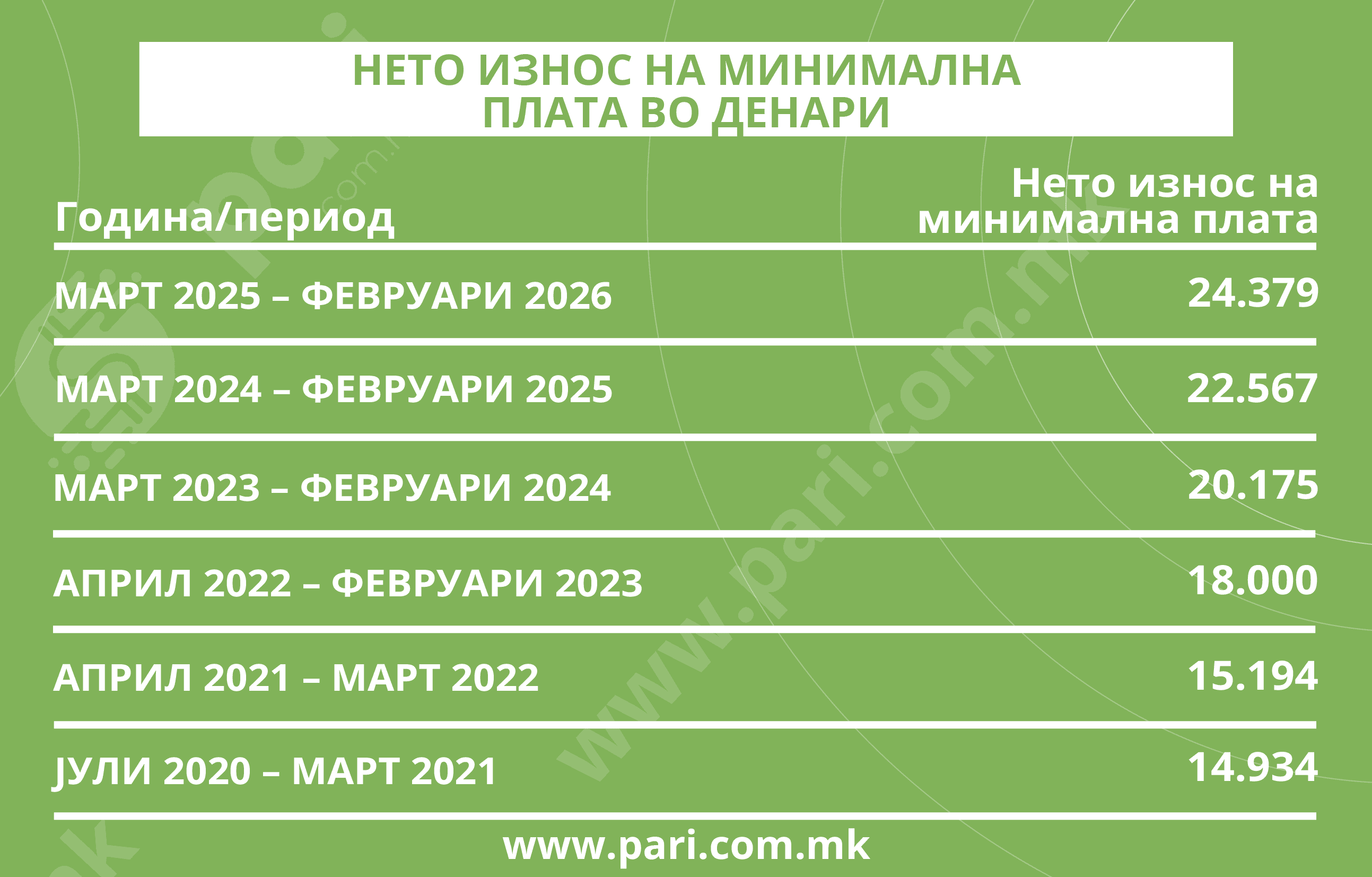 Во периодот од јули 2020 до март 2021 година минималната плата изнесувала 14.934 денари, а веќе за март 2025 – февруари 2026 достигнува 24.379 денари. Тоа значи дека за нешто помалку од шест години минималната плата е зголемена за 9.445 денари, односно за 63,2 насто. Со други зборови, денешната минимална плата е речиси две третини повисока во споредба со почетната година од анализата, што на прв поглед укажува на сериозен подем.