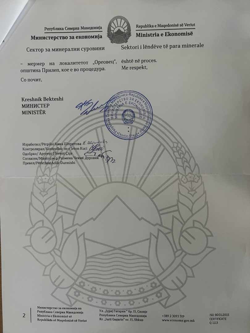 Дописот на Министерството за економија е во спротивност со информацијата што „ПАРИ“ ја доби од ЈП Државни патишта, од каде ни одговорија дека “ископот во близина на селото Ореовец се врши врз основа на концесија за експлоатација на минерални суровини технички градежен камен“ и дека „сите работи во врска со ископите се вршат согласно со добиените лиценци, одобренија и концесии за истражување и експлоатација на минералните суровини неопходни за изгрдба на државните патишта. Експлоатацијата на минералните суровини ќе се врши до завршувањето на изградбата на Коридорите 8 и 10“.