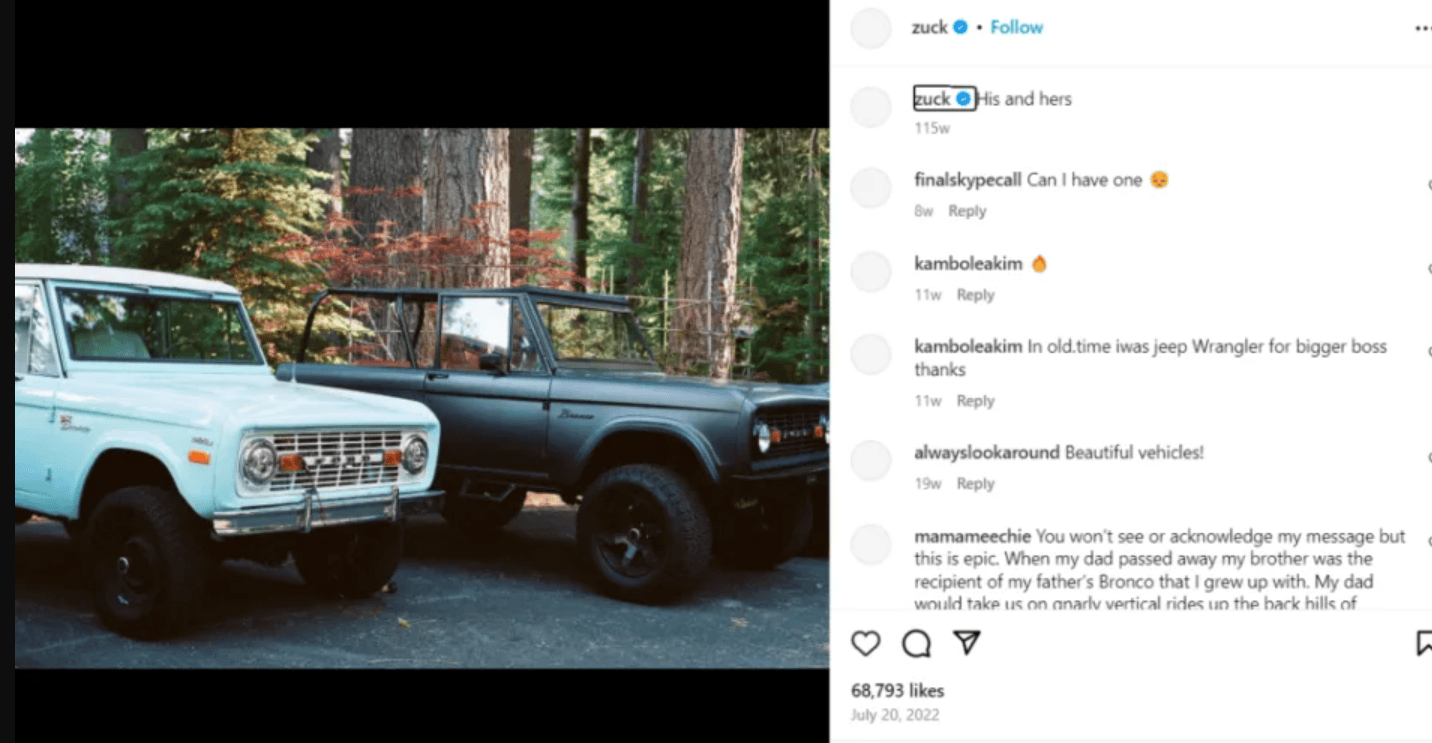Закерберг претходно сподели слична слика на која се прикажани две класични возила Форд Бронко, едното му припаѓа на Чан, а другото нему. „Неговата и нејзината“, ја нарече Закерберг фотографијата од јуни 2022 година.