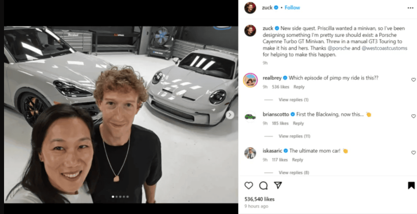 „Уфрлив мануелен GT3 Touring за да направам „негов и нејзин““, напиша Закерберг во својата објава на Инстаграм. Објавата беше придружена со слики од возилата на царината на западниот брег и исто така селфи на парот со двете возила Порше.