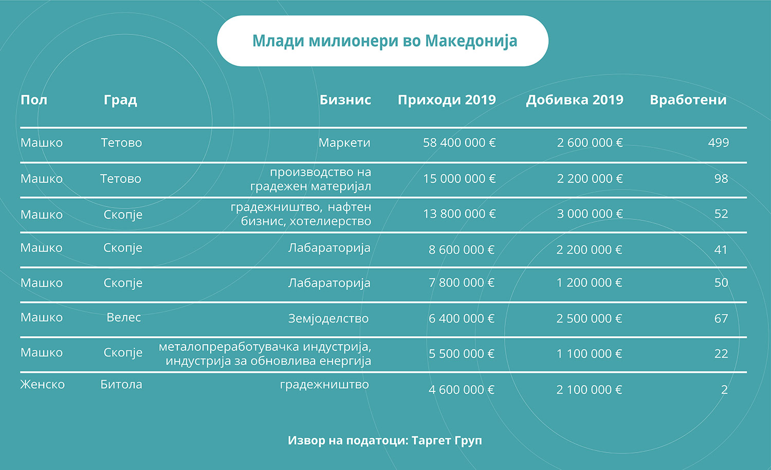 Имаат помалку од 35 години, а веќе се сопственици на бизниси во кои се вртат милиони евра. Во осум компании во земјава, каде приходите и добивките надминуваат неколку милиони сопствениците се помлади од 35 години. Бизнисите или се целосно нивни, или станува збор за семеен бизнис а некои имаат други бизнис партнери. „Таргет Груп“ направи листа на најмладите милионери во земјава а на неа се најдоа една жена и седум мажи.