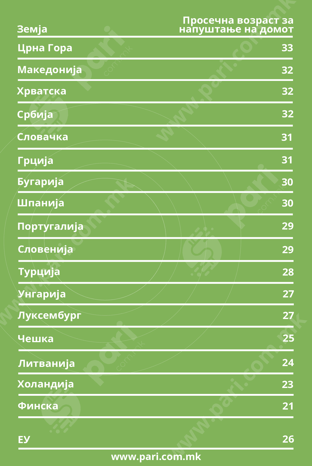 Според податоците на Евростат, актуелни до 2023 година, кој ги рангира европските земји според просечната возраст на која луѓето ги напуштаат своите родителски домови, балканските земји, а и Јужна Европа во целина, го напуштат родителско гнездо малку подоцна во животот.