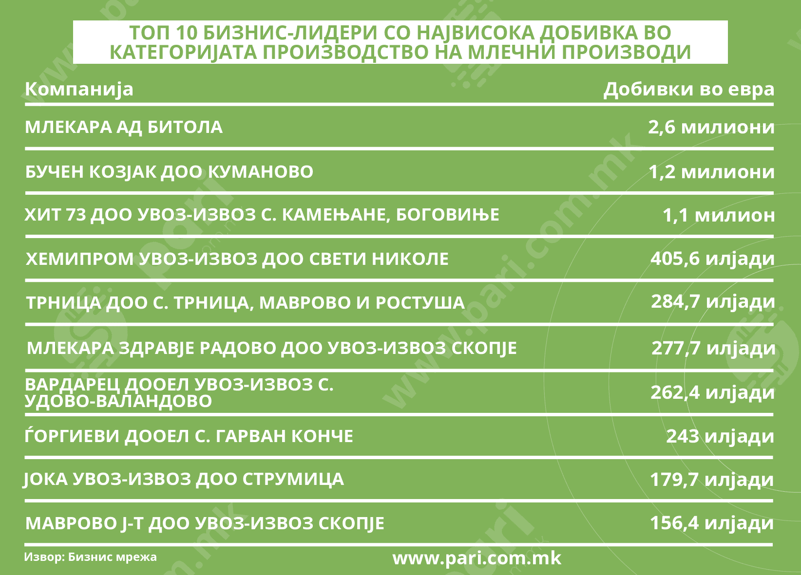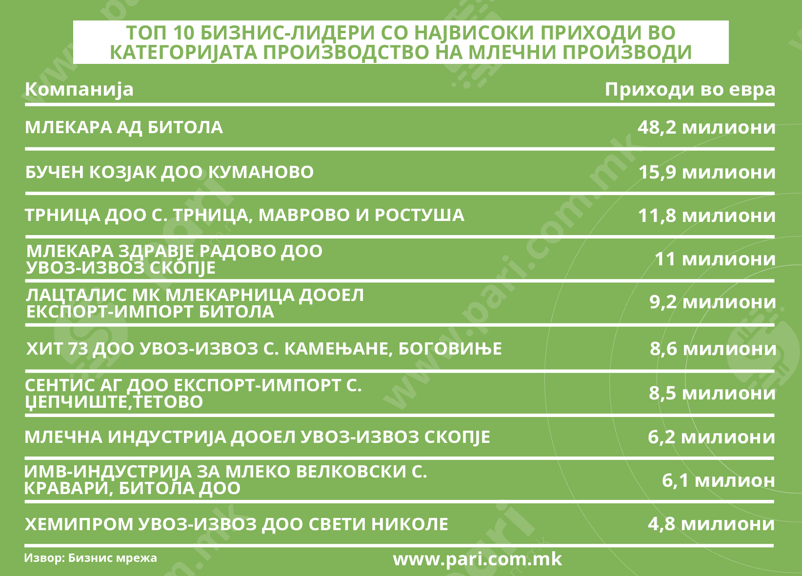 Млечната индустрија е една од најстабилните и најприсутните во македонското производство. Од чаша јогурт до парче кашкавал или сирење ‒ млечните производи се дел од секојдневието, но зад тие производи стојат компании што управуваат со милионски обеми, големи производствени капацитети и сериозни пазари. Секторот е концентриран околу неколку клучни компании, но тие го движат пазарот. Според анализата што ја подготви порталот Пари врз база на податоците од Бизнис Мрежа, врвните 10 компании во оваа индустрија во 2024 година направиле вкупен приход од 130,3 милиони евра, со добивка од 6,7 милиони евра, и вработуваат 940 луѓе.