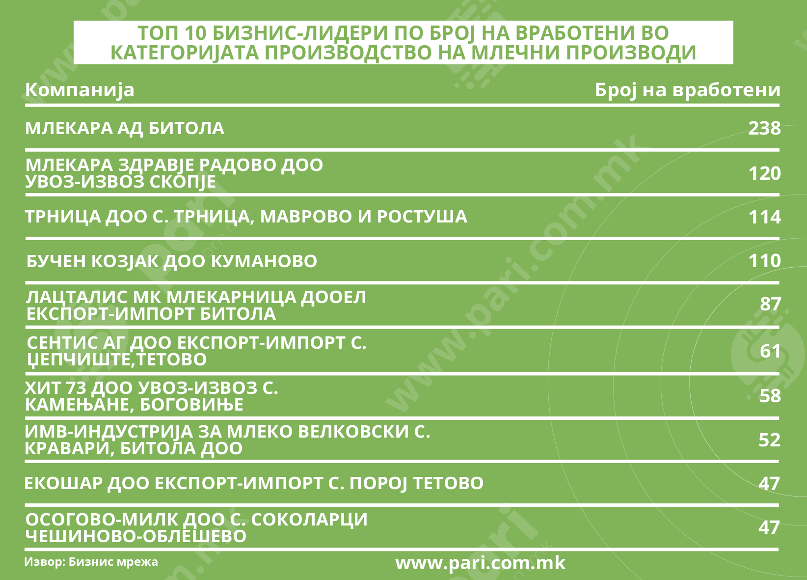 И во категоријата број на вработени, лидер е Млекара АД Битола, со 238 вработени, што е речиси четвртина од вкупниот број во категоријата. Зад неа се Здравје Радово со 120 и Трница со 114 вработени, што укажува дека овие млекарници имаат сериозен производствен капацитет. Бучен Козјак е четврта компанија со 110 вработени. На последното место се ЕКОШАР и ОСОГОВО-МИЛК, двете со по 47 вработени, иако не фигурираат во ниту една друга категорија.