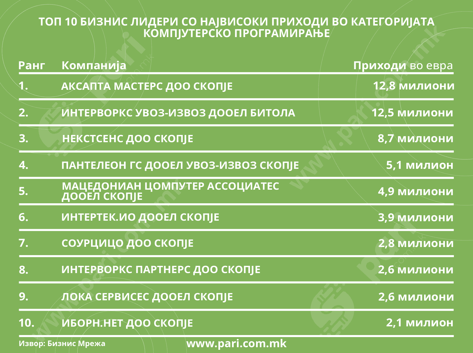 Добивка од над десет милиони евра, приходи повисоки од 58 милиони евра и 1.242 вработени се заедничките постигнувања на само десет компании од светот на компјутерското програмирање, кои се формирани и работат со домашен капитал. Станува збор за бизнис-лидерите во дејноста со шифра 62.01, од каде што произлегуваат резултати коишто ги креваат просеците во повеќе сегменти од македонската економија и имаат големо влијание врз неа, правејќи ја општата слика подобра отколку што е.
