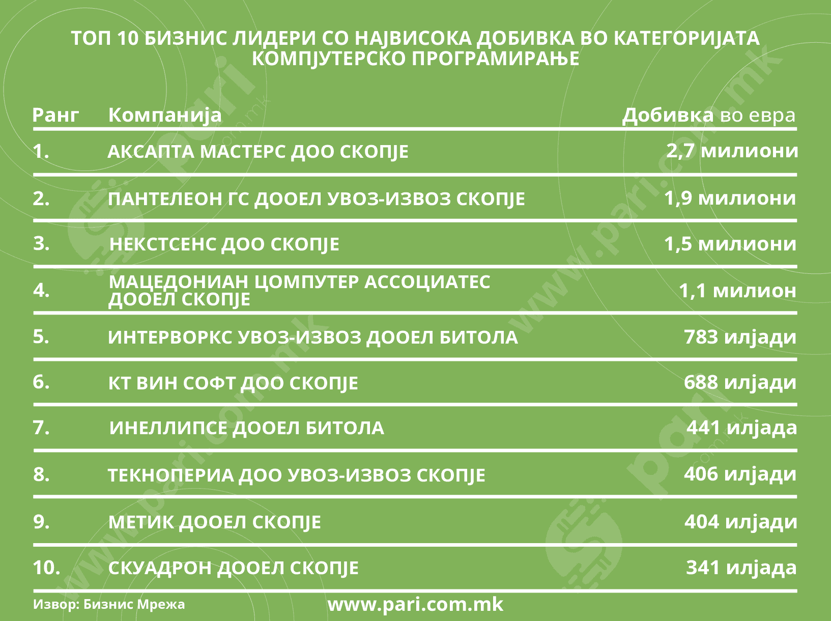 Анализата на Пари што следи во продолжение е направена врз податоците од БизнисМрежа. Ги опфаќа исклучиво фирмите во владение на македонски сопственици, од чии редови произлегуваат и бизнис-лидерите од оваа област, распоредени во три категории – добивка, приход и број на вработени.