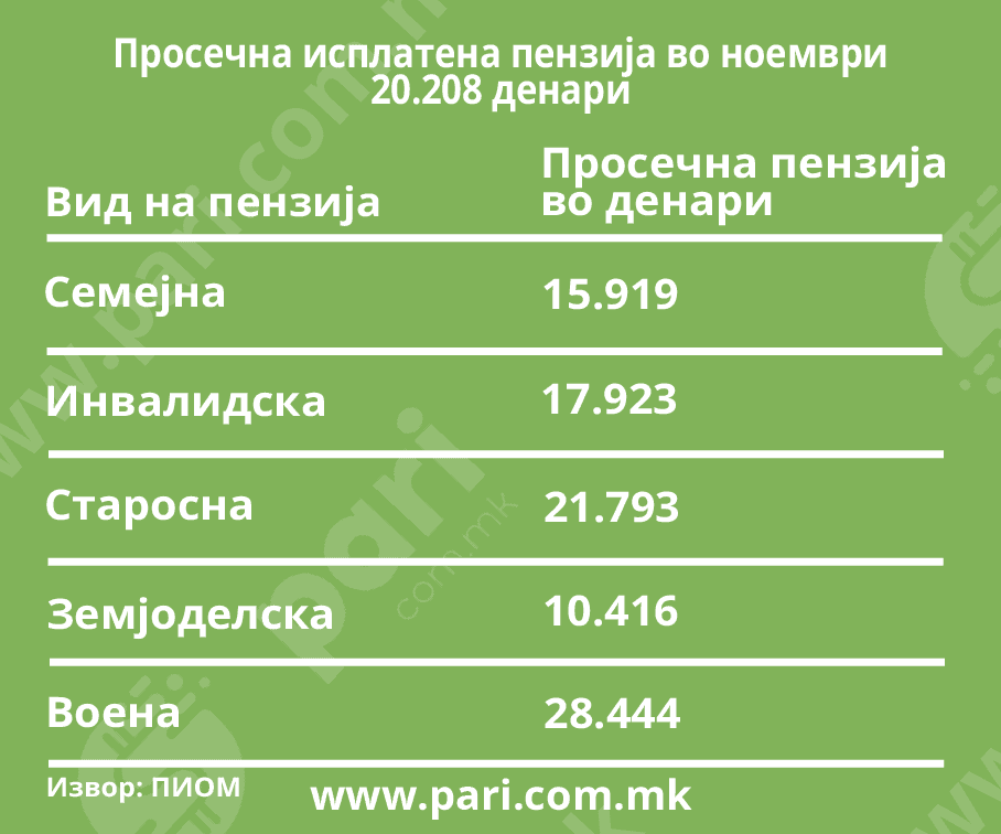 Просечната пензија е 20.208 денари. Во тие рамки, просекот на семејната пензија е 15.919 денари, на инвалидската – 17.923, на старосната – 21.793, на земјоделската – 10.416 и на воената – 28.444 денари.