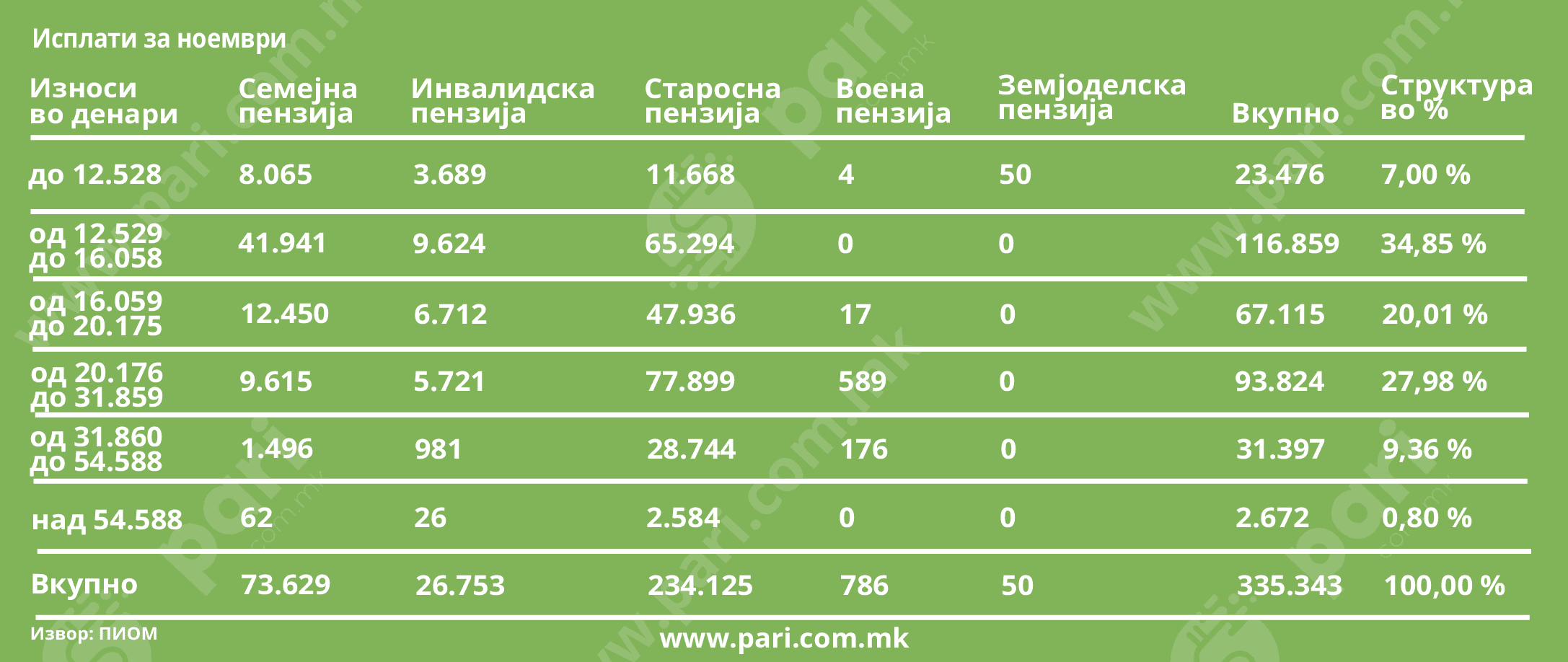 Статистиките, пак, на Фондот за пензиското и инвалидското осигурување за ноември кажуваат дека во земјава има 335.343 пензионери. Меѓу нив – 85.959 се корисници на најниските законски утврдени пензии, а само 74 на највисоката која надминува 70 илјадарки.