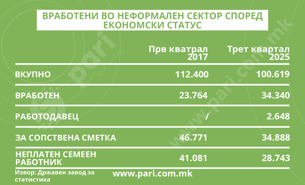 Податоците од Државниот завод за статистика покажуваат дека низ годините неформалниот сектор бавно се топи. Најраните податоци што се наоѓаат на базата МАКСТАТ се за првиот квартал од 2017 година, а тогаш во неформалниот сектор имало 112.400 вработени, или 11.781 вработени помалку отколку во третиот квартал годинава. Во проценти, тоа е за 10,5 насто помалку.
