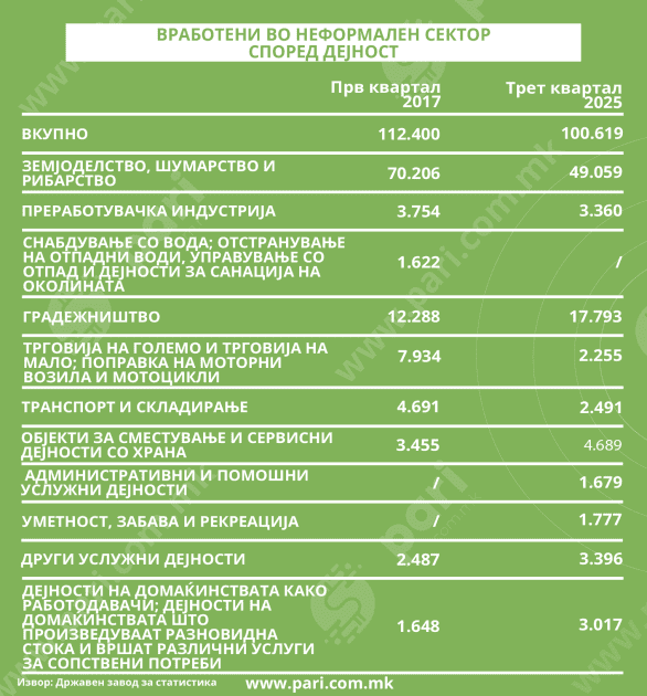 Во првиот квартал од 2017 година имало дури 70.206 неформално вработени во секторот земјоделство, шумарство и рибарство. Тоа е 62,5 насто од сите неформално вработени во тој период. Сега, во третиот квартал од 2025 година има 49.059, односно 48,8 насто.