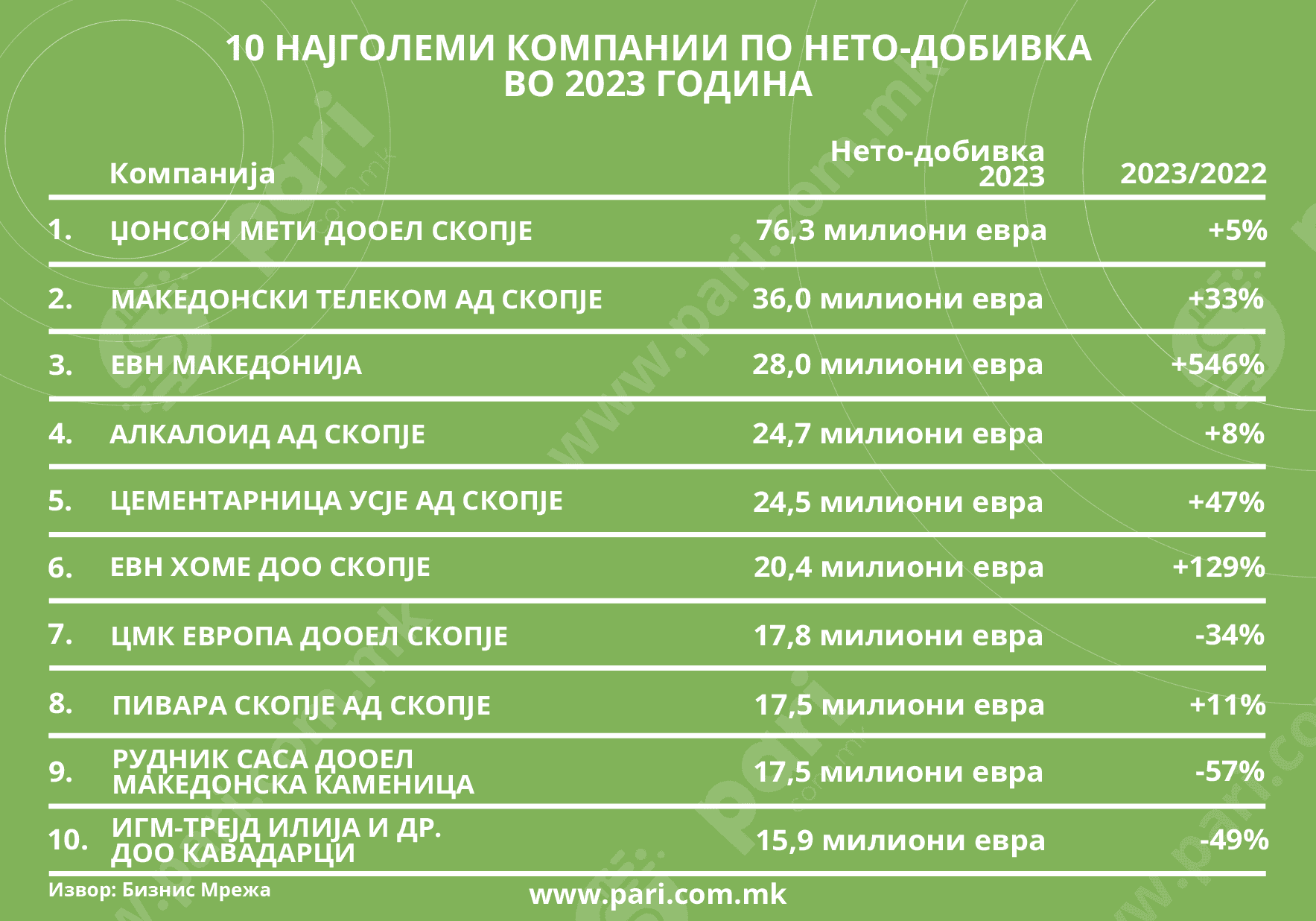 Како што може да се види од податоците, 7 од овие компании имаат раст на добивката, а „ЦМК Европа“, Рудникот САСА и ИГМ-Траде имаа пад. Притоа, импозантен е растот на добивката на ЕВН Македонија од дури 546%, со што лани достигнала профит од 28 милиони евра. ЕВН Македонија ги обединува ЕВН Хоме, ЕВН Снабдување, ЕВН Електрани и Електродистрибуција. Покрај добивката на оваа групација која се наоѓа на третото место, на шестото место е поединечната сметка на ЕВН хоме, компанија преку која со струја се снабдуваат домаќинствата и само таа лани имала добивка од 20 милиони евра, со што направила скок од 129%.