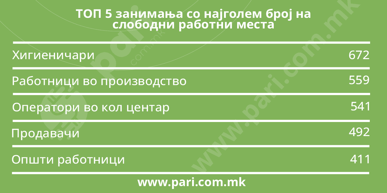 Последната анализа на слободните работни места од Агенцијата за вработување покажува дека најмногу се бараат хигиеничари на станбен и деловен простор. Понудата е за 672 слободни работни места од вкупно 9.109 слободни работни места. Овие податоци автоматски се обработуваат, соодветно на моменталната понуда.
