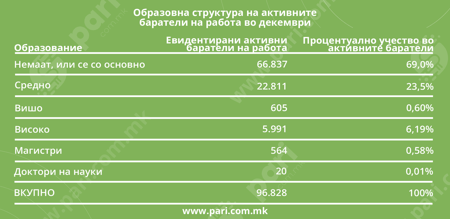 Работодавачите обично велат дека им недостига квалификуван кадар, но се жалат дека не може да се најде ниту хигиеничар(ка). Сепак, барем за попростите, односно поедноставните работни задачи би требало да се дојде до кадар, затоа што дури 69 отсто од тие што бараат работа се без образование, или само со основно образование. Нивниот број е 66.837! Значи, повеќе од две третини од пазарот на труд е со минимални квалификации, или воопшто нема некои посебни вештини. Па, прашањето е дали голем дел од оваа група е на сивиот пазар на труд, користи социјална помош, и во крајна линија – не е заинтересиран за вистинско вработување, а се пријавува во Агенцијата за вработување како корисник на одредени бенифиции.
