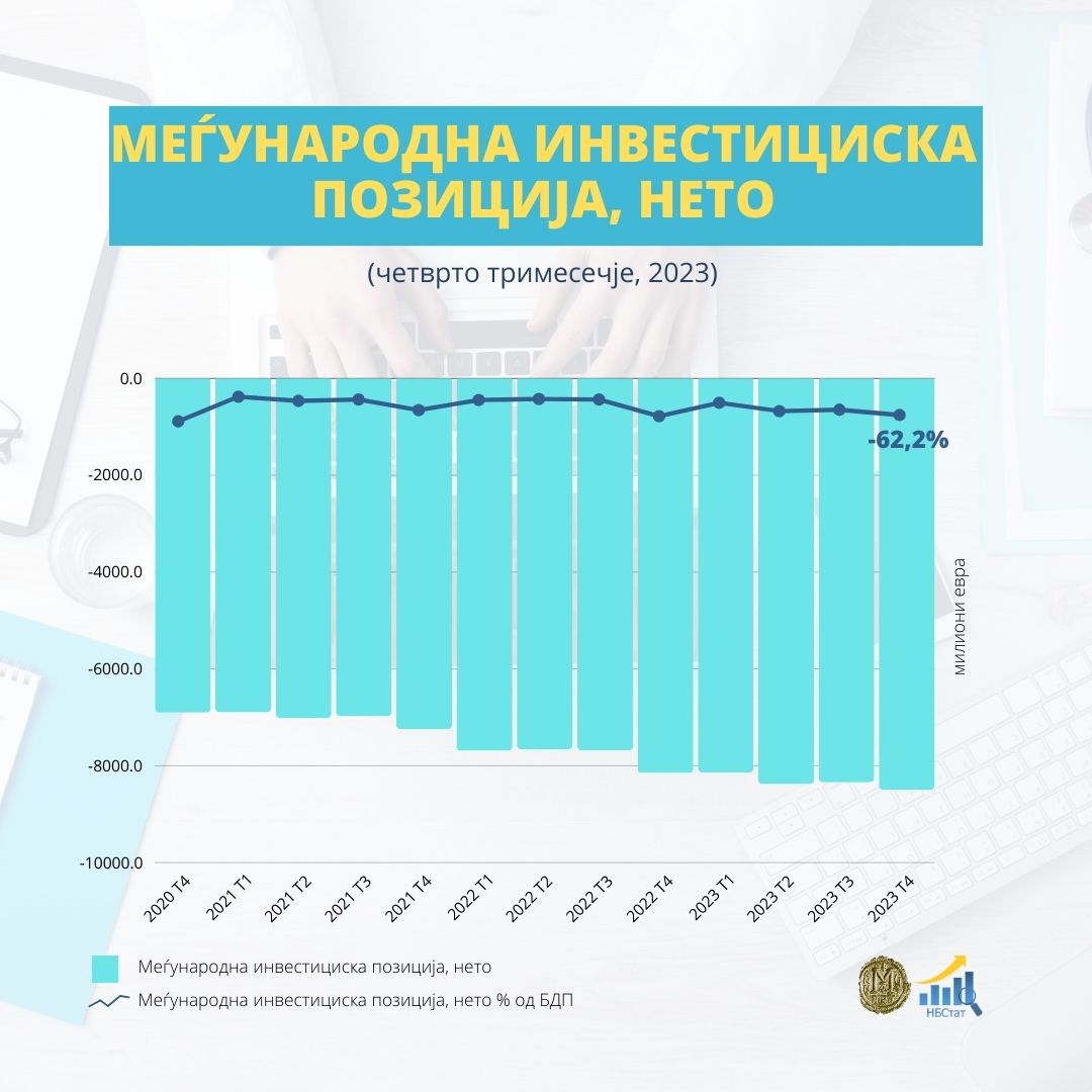 Во текот на четвртиот квартал од 2023 година, негативната нето меѓународна инвестициска позиција (МИП) е зголемена за 160 милиони евра и изнесува 8.500 милиони евра, односно 62,2% од проценетиот БДП за 2023 година.