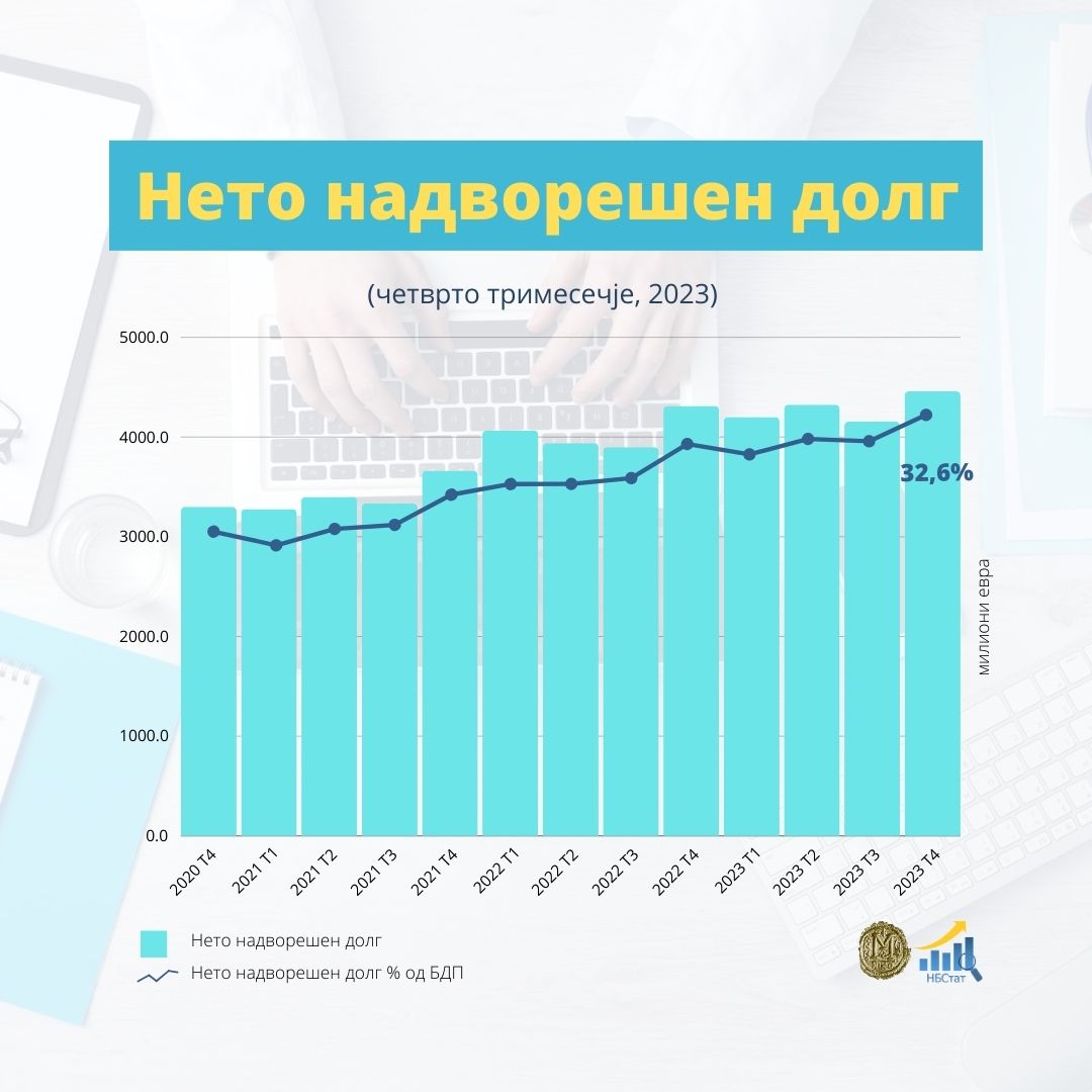 На 31.12.2023 година, нето надворешниот долг изнесува 4.458 милиони евра (или 32,6% од проценетиот БДП). Нето надворешниот долг на земјата, во четвртиот квартал од 2023 година, е зголемен за 305 милиони евра, или за 7,3%. Од аспект на структурата, приватниот нето-долг и натаму има поголемо учество во вкупниот нето-долг со 67%.