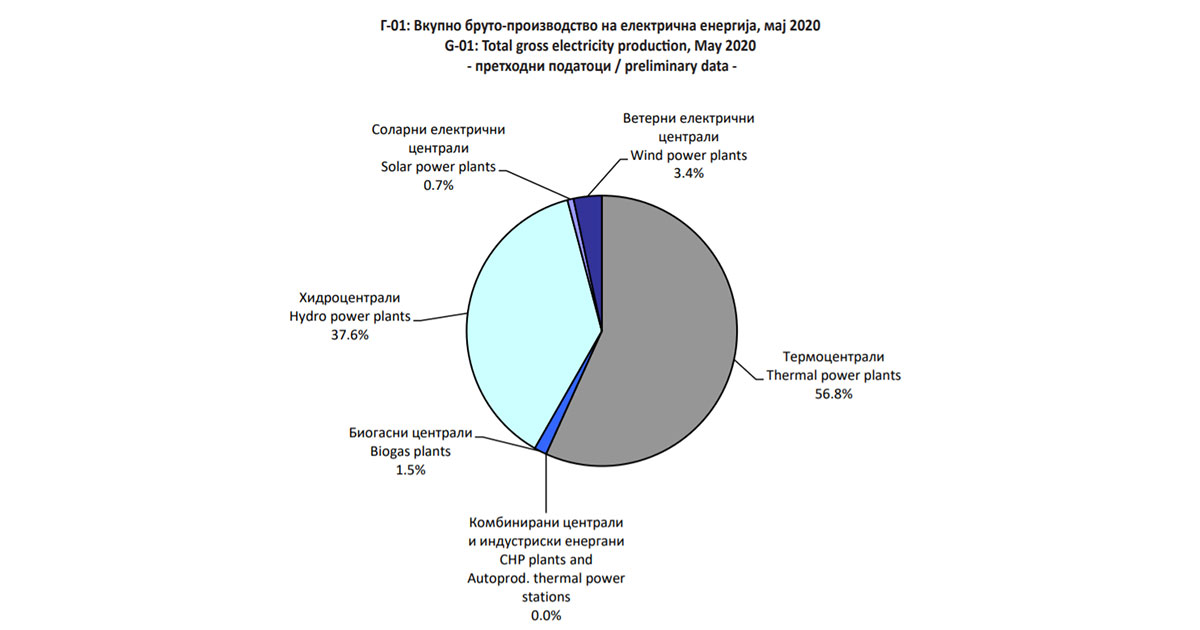 Според податоците на Државниот завод за статистика, во мај 2020 година, вкупната потрошувачка по видови енергенти изнесува: 524 980 МWh електрична енергија, 3.505 мил. нм3 природен гас, 363 229 тони јаглен и 79 336 тони нафтени продукти.