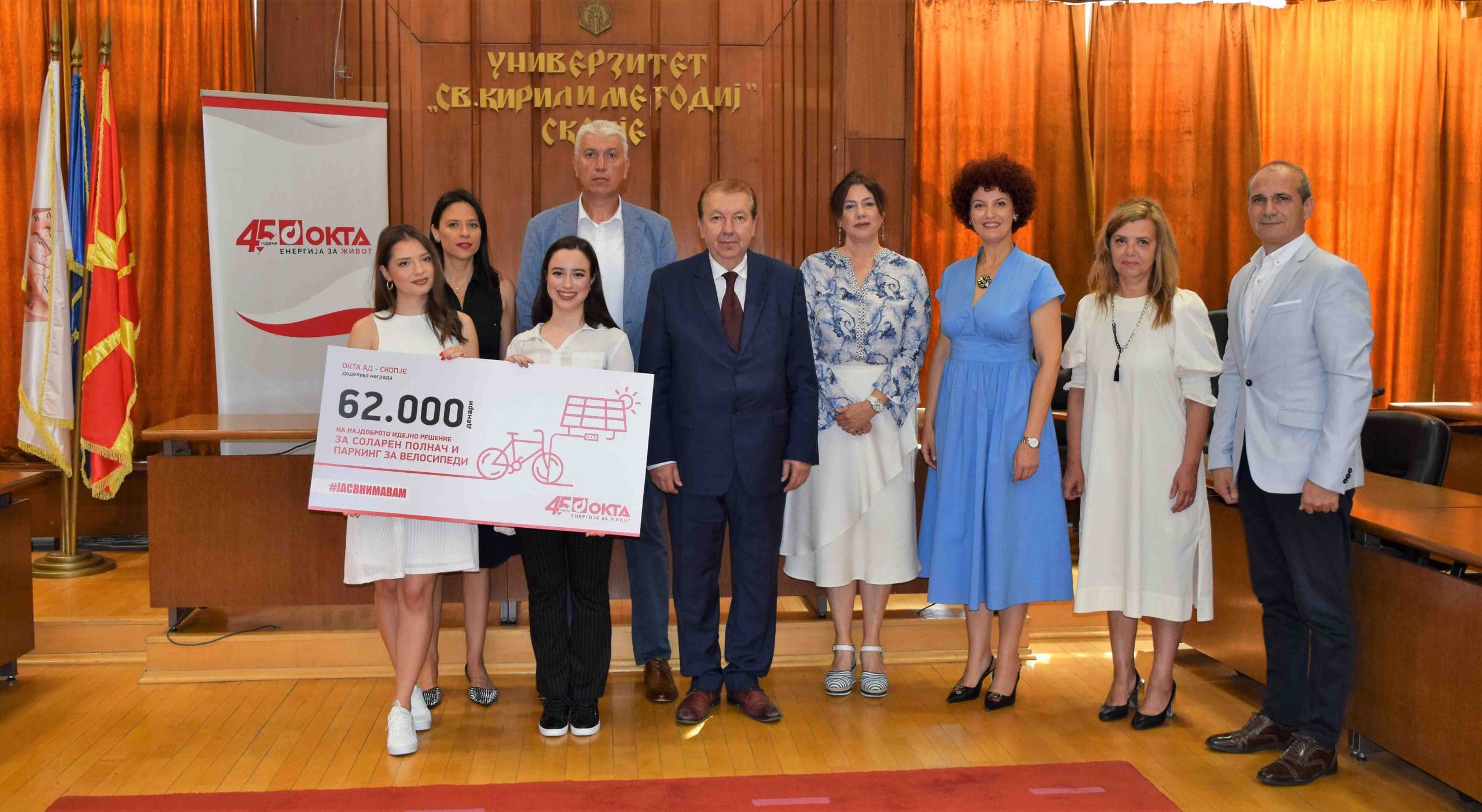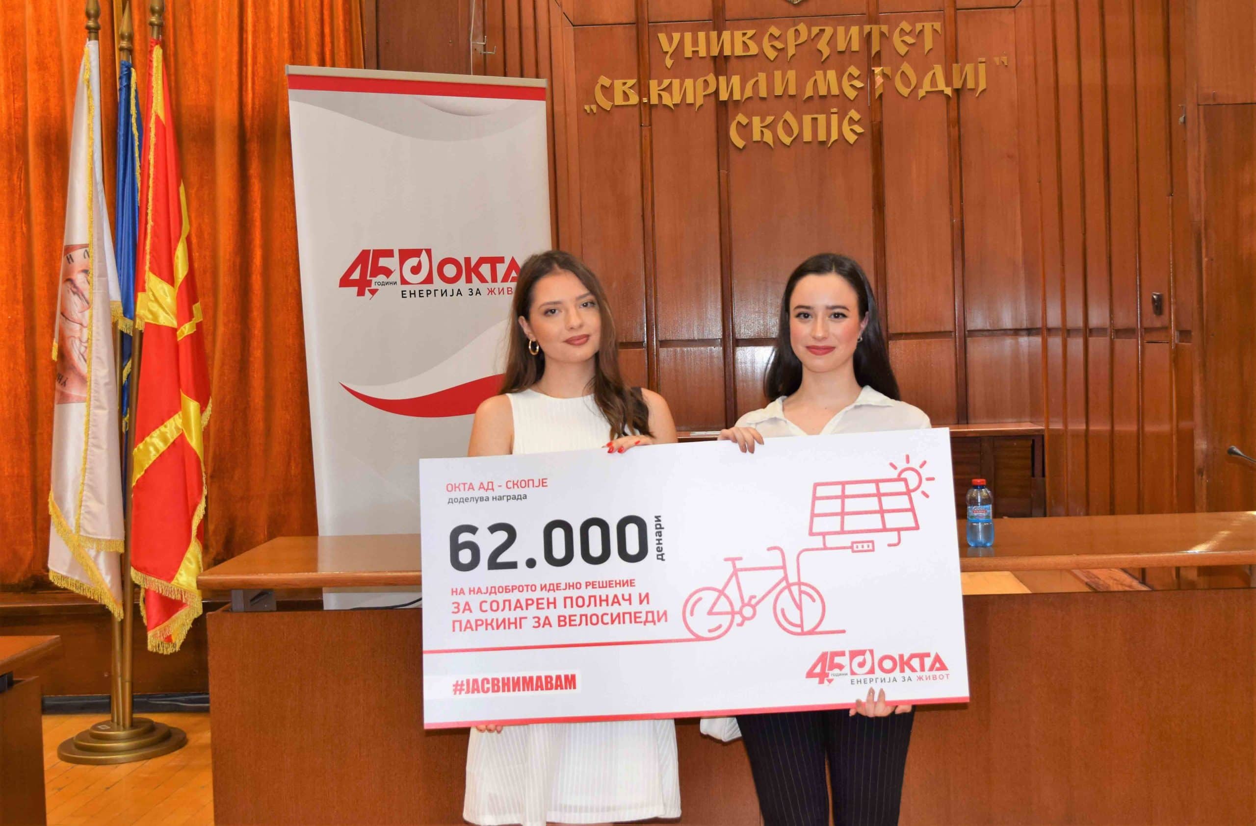 Тимот составен од Ивана Попоска од Факултетот за електротехника и информациски технологии и Елена Новеска од Архитектонскиот факултет – Скопје е победник на конкурсот за избор на идејно решение за соларен полнач и паркинг за велосипеди. Конкурсот беше организиран од компанијата Окта во соработка со Центарот за кариера при Универзитетот „Свети Кирил и Методиј“.