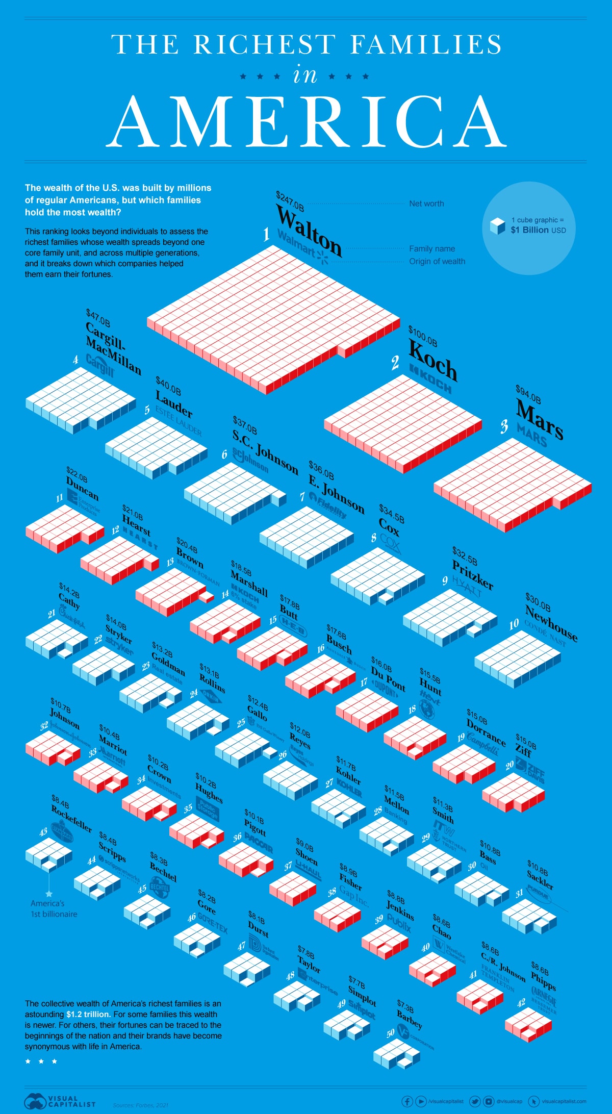 Визуелизацијата, која ги користи најновите податоци на Форбс, ги открива најбогатите семејства во Америка и компаниите кои им помогнале да заработат милијарди.