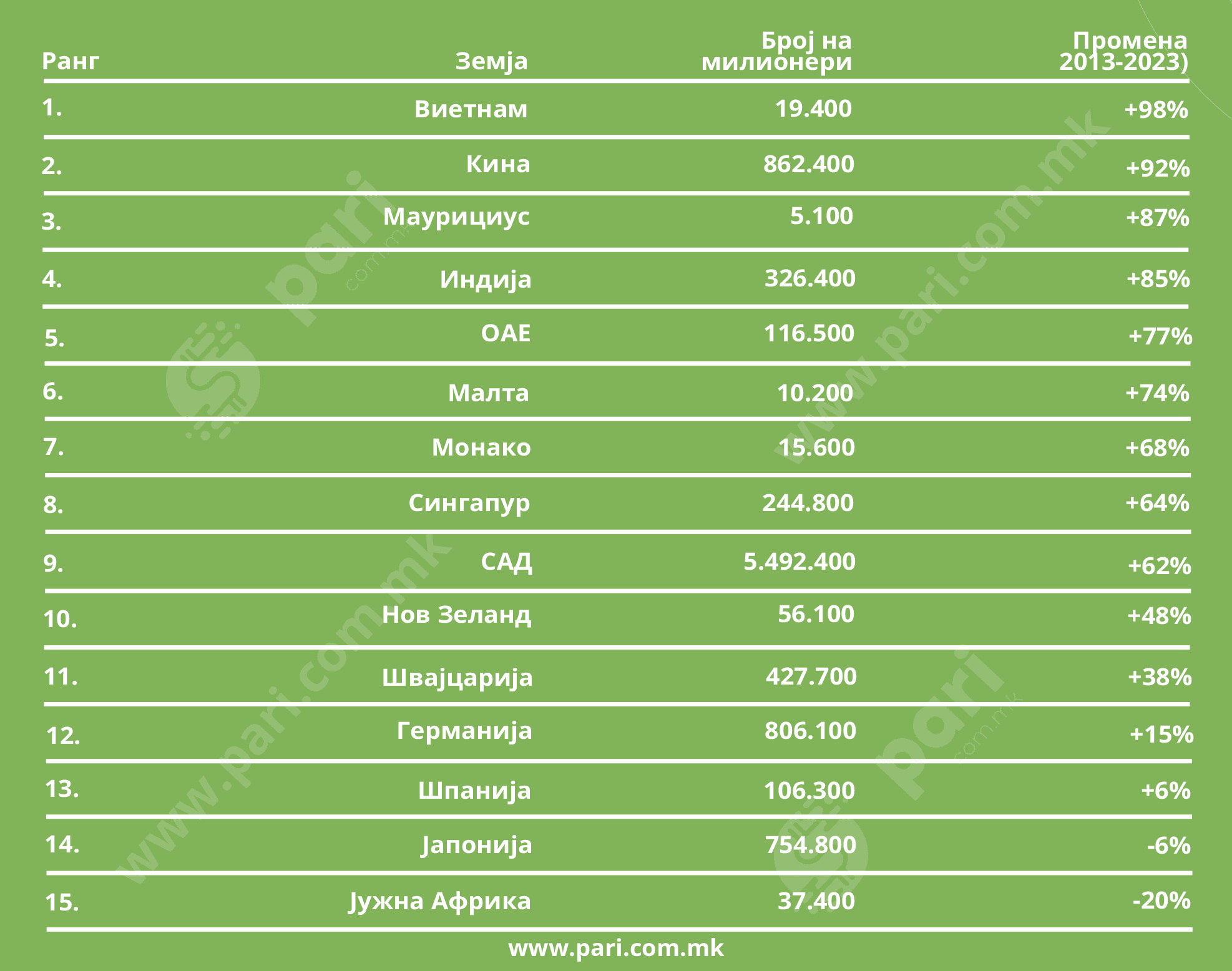 Извештајот за миграција на приватното богатство на „Хенли енд партнерс“ за 2024 година дава податоци за растот на популацијата на милионери по земја меѓу 2013 и 2023 година.